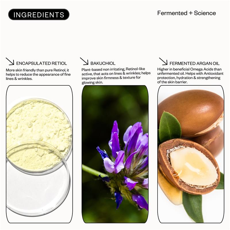 Ingredients Aqua (Water), C 13-15 Alkane, Cetearyl Alcohol, Glycerin, Caprylic/Capric Triglyceride, Niacinamide, Butyrospermum Parkii (Shea) Oil, Ceteareth-20, Saccharide Isomerate, Lactobacillus Ferment Lysate, Sorbitan Stearate, Bakuchiol, Saccharomyces/ Rice Ferment Filtrate, Inulin, Pseudozyma Epicola/Argania Spinosa Kernel Oil Ferment Filtrate, Saccharomyces Cerevisiae Extract, Crocus Sativus Flower Extract, Crambe Abyssinica Seed Oil Phytosterol Esters, Retinol, Cellulose Acetate Butyrate, Phenoxyethanol, Caprylyl Glycol, Parfum (Fragrance), Tricaprylin, Pentylene Glycol, Fructose, Disodium EDTA, PEG 20 Stearate, Pentaerythrityl Tetra-di-tbutylhydroxyhydrocinnamate, Silica Silicate, Citric Acid, Sodium Citrate, Silica, 1,2-Hexanediol, Magnesium Stearate, Sodium Benzoate, Potassium Sorbate, Caramel, CI 17200, CI 42090 Contains: Fermented Rice Water + Bakuchiol