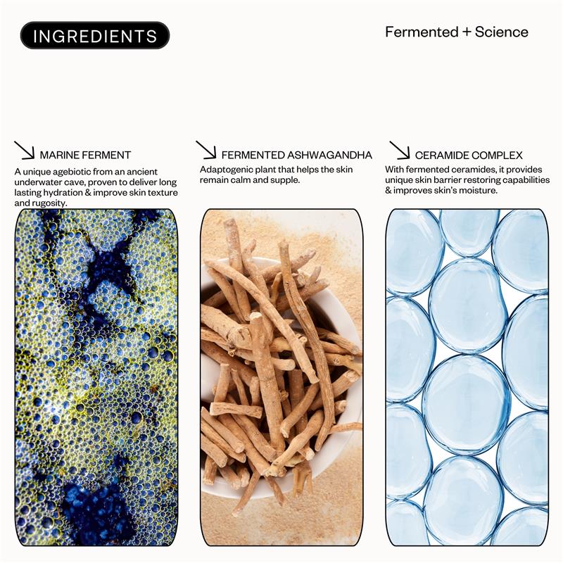 Ingredients Aqua (Water), Glycerin, Stearic Acid, Caprylic/Capric Triglyceride, C 13-15 Alkane, Niacinamide, Cetearyl Alcohol, Aluminum Starch Octenylsuccinate, Pseudozyma Epicola/Olive Fruit Oil Ferment Filtrate, Myristyl Myristate, Lactobacillus Ferment Lysate, Inulin, Saccharomyces/Viscum Album Ferment Extract, Lactobacillus/Soybean Ferment Extract, Saccharomyces Cerevisiae Extract, Saccharomyces/Imperata Cylindrica Root Ferment Extract, Bacillus Ferment, Withania Somnifera Root Extract, Ceramide NP, Ceramide AP, Ceramide EOP, Benzyl Alcohol, Sodium Acrylate/Sodium Acryloyldimethyl Taurate Copolymer, Parfum (Fragrance), Butylene Glycol, Isohexadecane, Carbomer, Polysorbate 80, Dehydroacetic Acid, Pentylene Glycol, Fructose, Sodium Lauroyl Lactylate, Sorbitan Oleate, 1,2-Hexanediol, Caprylyl Glycol, Phenoxyethanol, Phytosphingosine, Cholesterol, Xanthan Gum, CI 19140, CI 20285 Contains: Marine Ferment + Ceramide Complex