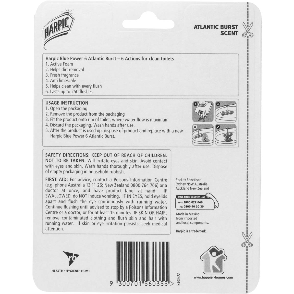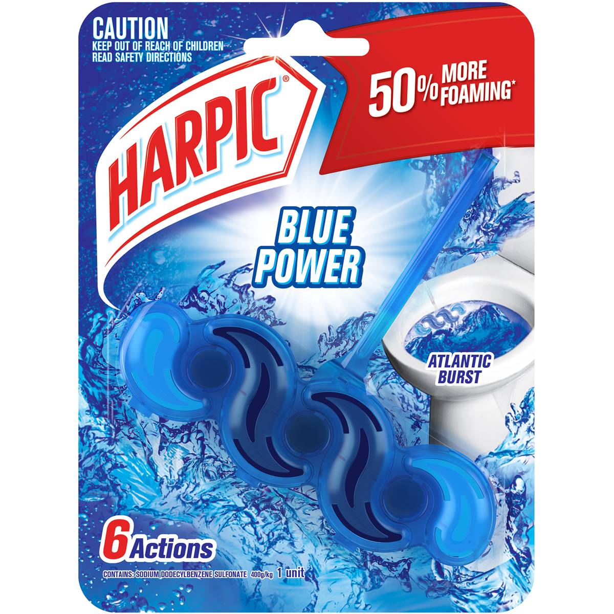 Harpic Fresh Power Atlantic Burst Toilet Block The easy way to maintain a clean, fresh and fragrant toilet with every flush…Harpic Fresh Power  Atlantic Burst Toilet Block – helps remove dirt and stains and provides a lasting fresh fragrance.  6 actions:  Cleans with every flush Dirt removal Anti-limescale Lasts up to 4 weeks Pleasant fragrance Active foam  No added: bleach or phosphates Recycling tip: Blister and hanger are recyclableThe easy way to maintain a clean, fresh & fragrant toilet with every flush!Long-lasting Atlantic Burst Fragrance50% more foaming (vs previous formula)No added: bleach or phosphates