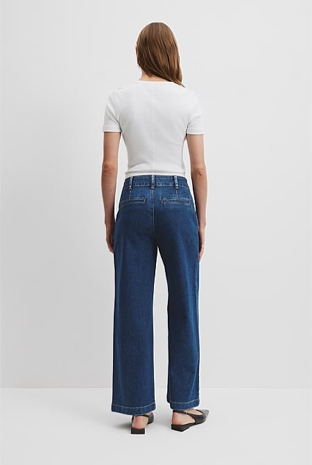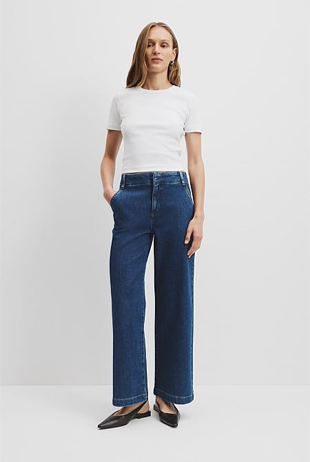 In the making of this jean, we've partnered with Saitex, an industry-leading manufacturer that's revolutionising the way denim is made to address energy use, water consumption and waste. This style has a wide leg silhouette and a high rise waist. Designed in our comfort stretch denim, it's fitted through the waist, with a zip fly and hook-and-bar closure. Franny is 174cm tall with a 84cm bust, 64cm waist and 84cm hips and wears a size XS/8.