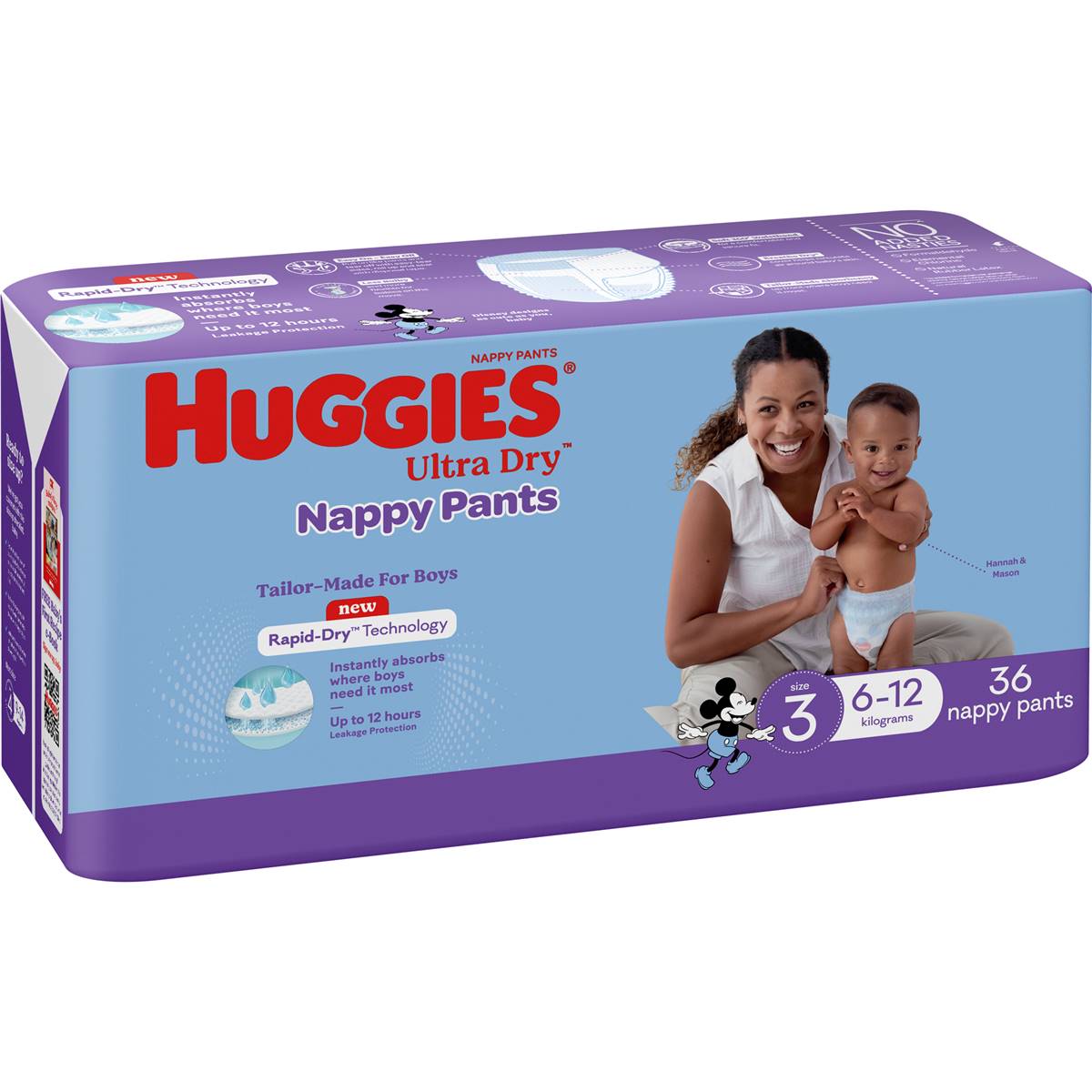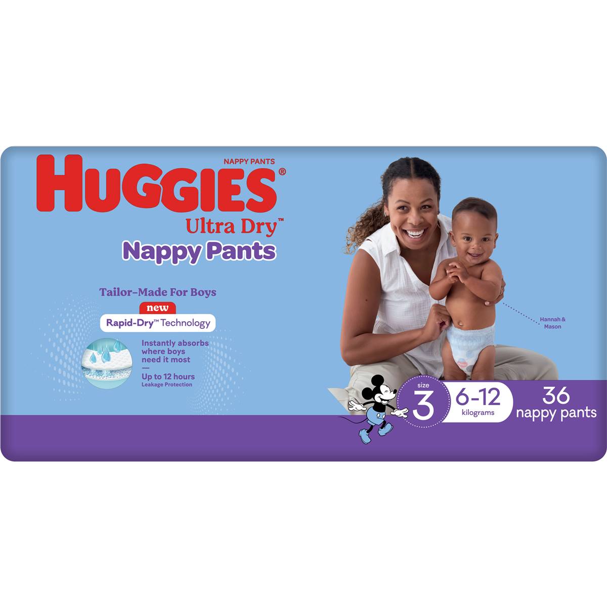 Huggies Ultra Dry Nappy Pants with Rapid-Dry Technology instantly absorbs for drier skin, where they need it most. Keeping baby snug & dry, day & night with up to 12hrs leakage protection.  Rapid-Dry Technology – Wet to Dry in under 10 secondsSoft & stretchy 360 degree waistband - Provides a comfortable and secure fit and pulls up and down for easy changesTailor-made absorbency for boys - Perfectly suited for baby boys, with targeted absorbency up-front where boys need it most.Made for day and all night - Up to 12 hours leakage protection. So you and baby sleep through the night.Disney designs - With your favourite Disney characters.^^Designs may varyOnly the good stuff - No Added Nasties*. Crafted with simply the best, our nappies have no added formaldehyde, elemental chlorine or natural rubber latex. * No added formaldehyde, elemental chlorine, natural rubber latex or other chemicals restricted by Kimberly-Clark