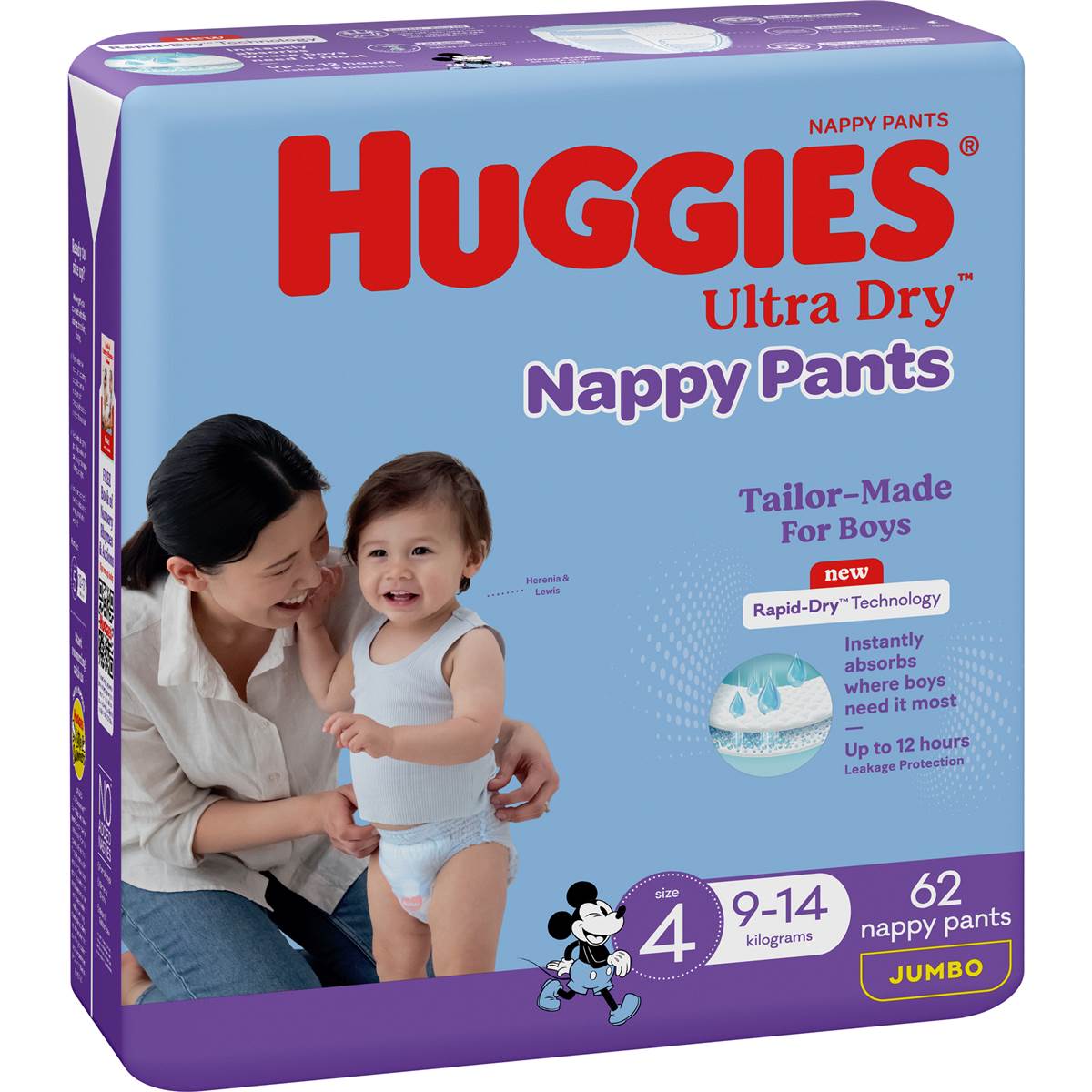 Huggies Ultra Dry Nappy Pants with Rapid-Dry Technology instantly absorbs for drier skin, where they need it most. Keeping baby snug & dry, day & night with up to 12hrs leakage protection.  Rapid-Dry Technology – Wet to Dry in under 10 secondsSoft & stretchy 360 degree waistband - Provides a comfortable and secure fit and pulls up and down for easy changesTailor-made absorbency for boys - Perfectly suited for baby boys, with targeted absorbency up-front where boys need it most.Made for day and all night - Up to 12 hours leakage protection. So you and baby sleep through the night.Only the good stuff - No Added Nasties*. Crafted with simply the best, our nappies have no added formaldehyde, elemental chlorine or natural rubber latex. * No added formaldehyde, elemental chlorine, natural rubber latex or other chemicals restricted by Kimberly-ClarkDisney designs - With your favourite Disney characters.^^Designs may vary