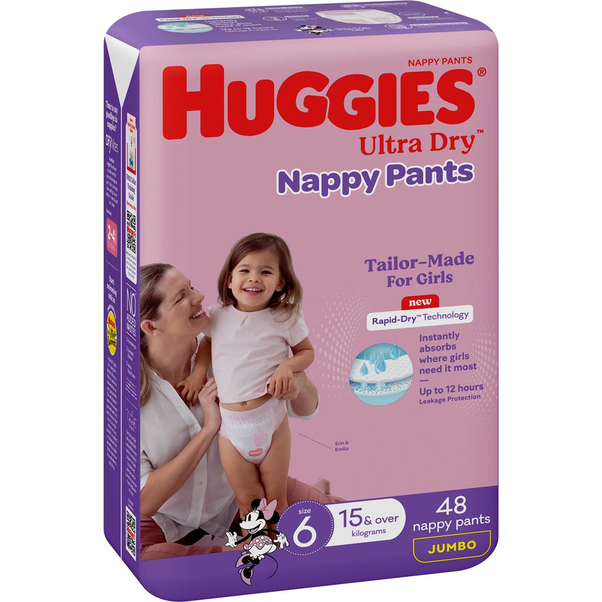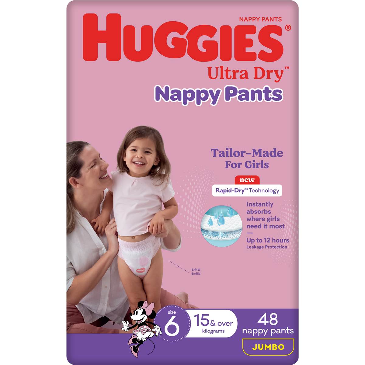 Huggies Ultra Dry Nappy Pants with Rapid-Dry Technology instantly absorbs for drier skin, where girls need it most.  Keeping baby snug & dry, day & night with up to 12hrs leakage protection.  Rapid-Dry™ Technology – Wet to Dry in under 10 secondsSoft & stretchy 360 degree waistband - Provides a comfortable and secure fit and pulls up and down for easy changesTailor-made absorbency for girls - Perfectly suited for baby girls, with targeted absorbency lower-down where girls need it most.Made for day and all night - Up to 12 hours leakage protection. So you and baby sleep through the night.Disney designs - With your favourite Disney characters.^^Designs may varyOnly the good stuff - No Added Nasties*. Crafted with simply the best, our nappies have no added formaldehyde, elemental chlorine or natural rubber latex. * No added formaldehyde, elemental chlorine, natural rubber latex or other chemicals restricted by Kimberly-Clark