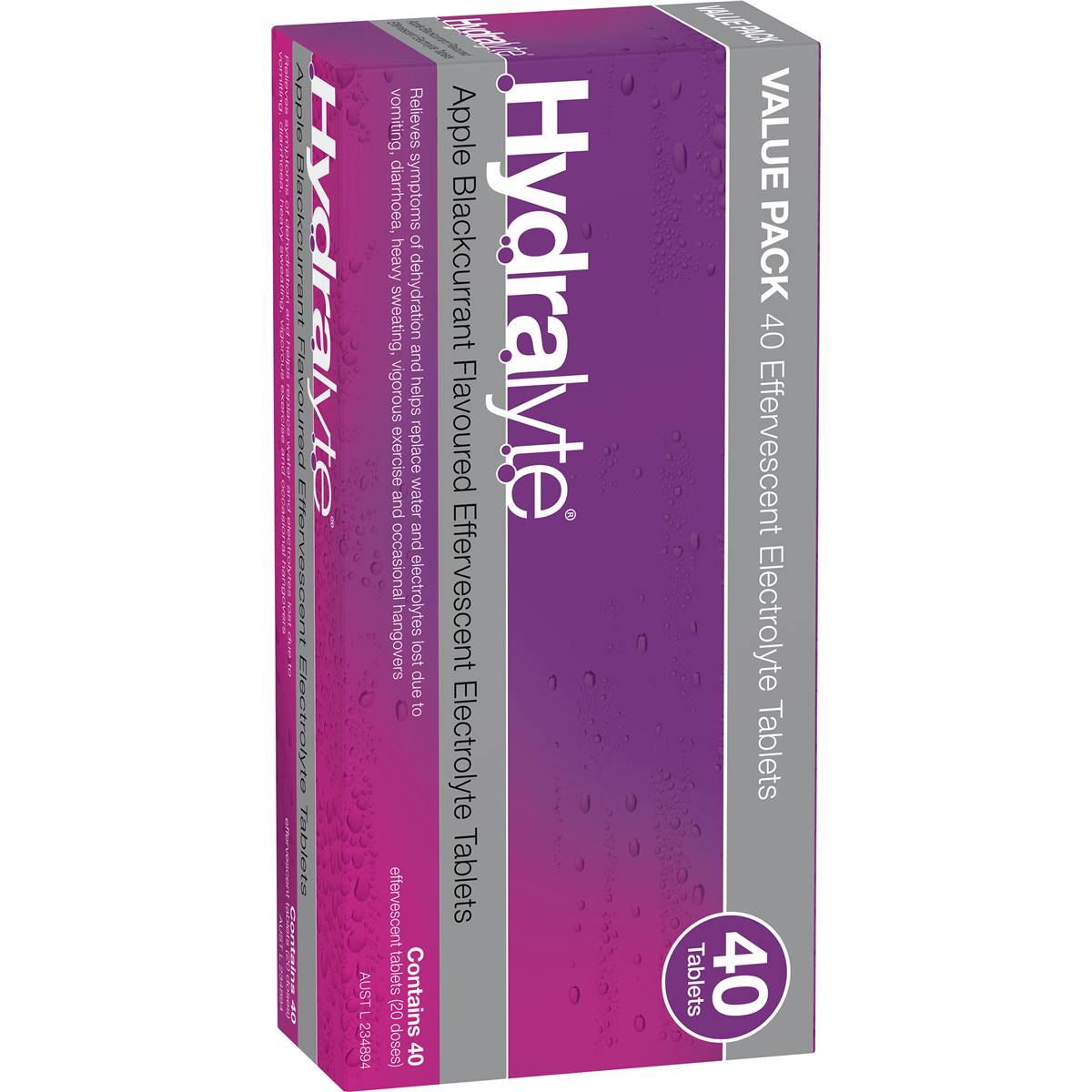 Hydralyte Effervescent Electrolyte Tablets Apple Blackcurrant Flavoured relieves symptoms of dehydration and helps replace water and electrolytes lost due to vomiting, diarrhoea, heavy sweating, vigorous exercise and occasional hangovers.Hydralyte Effervescent Electrolyte Tablets Apple Blackcurrant Flavoured relieves symptoms of dehydration and helps replace water and electrolytes lost due to vomiting, diarrhoea, heavy sweating, vigorous exercise and occasional hangovers.Dehydration due to:- Vomiting & diarrhoea.- Heat.- Travel.- Vigorous exercise.- Heavy sweating.- Occasional hangovers.- Heat & excessive exercise at work.Signs of mild dehydrationSticky or dry mouth, increased thirst, lethargy, decreased urine output, dark yellow urine.No added GlutenNo artificial flavoursNo artificial coloursKosher CertifiedPreservative Free