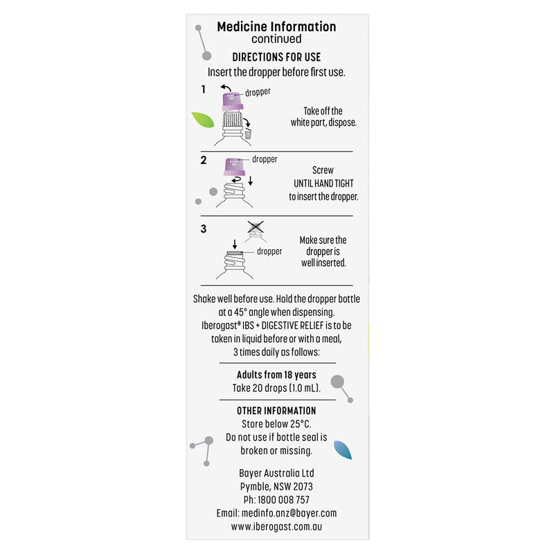Iberogast IBS + DIGESTIVE RELIEF is a clinically proven, all-in-one herbal solution to effectively relieve 6 digestive symptoms. Iberogast IBS + DIGESTIVE RELIEF is an effective treatment for medically diagnosed IBS and a range of digestive symptoms such as heartburn, stomach pain and cramps, indigestion, bloating and gas, constipation, diarrhoea and nausea so you can feel good on the inside.1,2Suitable For: Adults from 18 years of age and over.