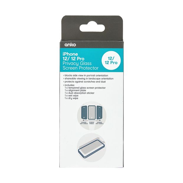 Product DetailsIncludes 1 x tempered glass screen protector, 1 x wet wipe, 1 x dry wipe and 1 x dust absorption stickerDimensions/Size: 14.3cm (H) x 6.8cm (W)Material: GlassColour: ClearFeaturesCompatible with iPhone 12 and 12 ProBlocks side view in portrait orientationShareable viewing in landscape orientationProtects against scratches and dustDouble strengthHardenedAdditional InformationUsage instructions given on packaging. Please follow instructions carefully.WarrantyManufacturer warranty: 12 months