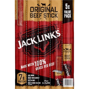 Smoky, savoury, and ready when you are. Jack Link’s Original Beef Sticks are made with 100% grass-fed beef and smoked low and slow for full-bodied flavour. Each stick delivers a clean, meaty bite with no mess, no crumbs, and no fuss. With 7g of protein per stick and less than 100 calories, it’s the perfect snack to keep you moving - wherever the day takes you. Now in a 5-stick value pack, so you’re never caught short.  Made with 100% grass-fed beef 7g protein per 25g stick Wood-smoked for bold flavour Under 100 calories per stick Low sugar, high satisfaction Whether you're chasing deadlines or road signs - Jack Link’s Beef Sticks are made to move. Feed Your Wild Side.