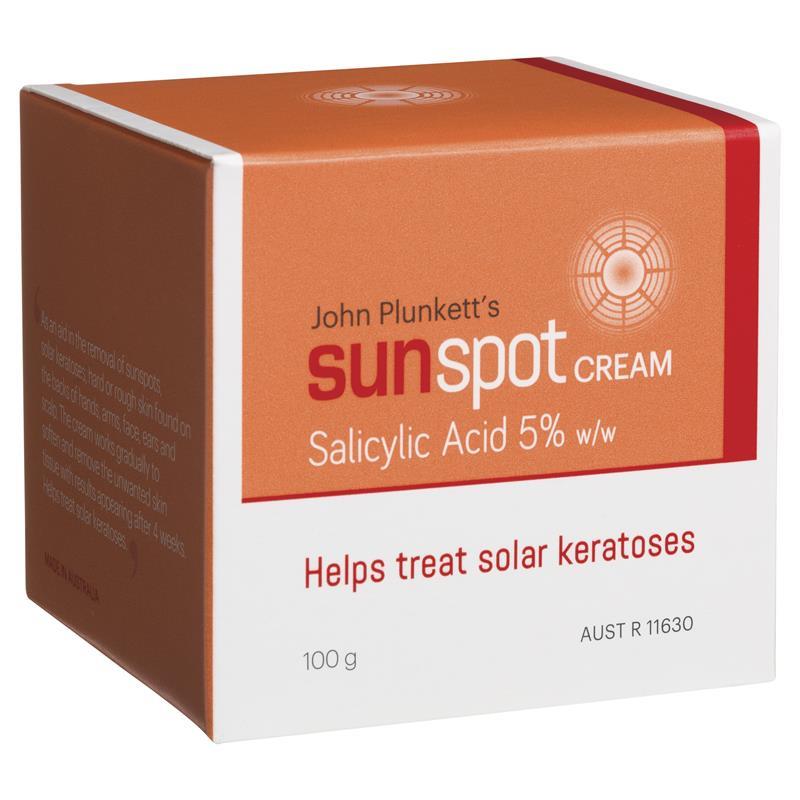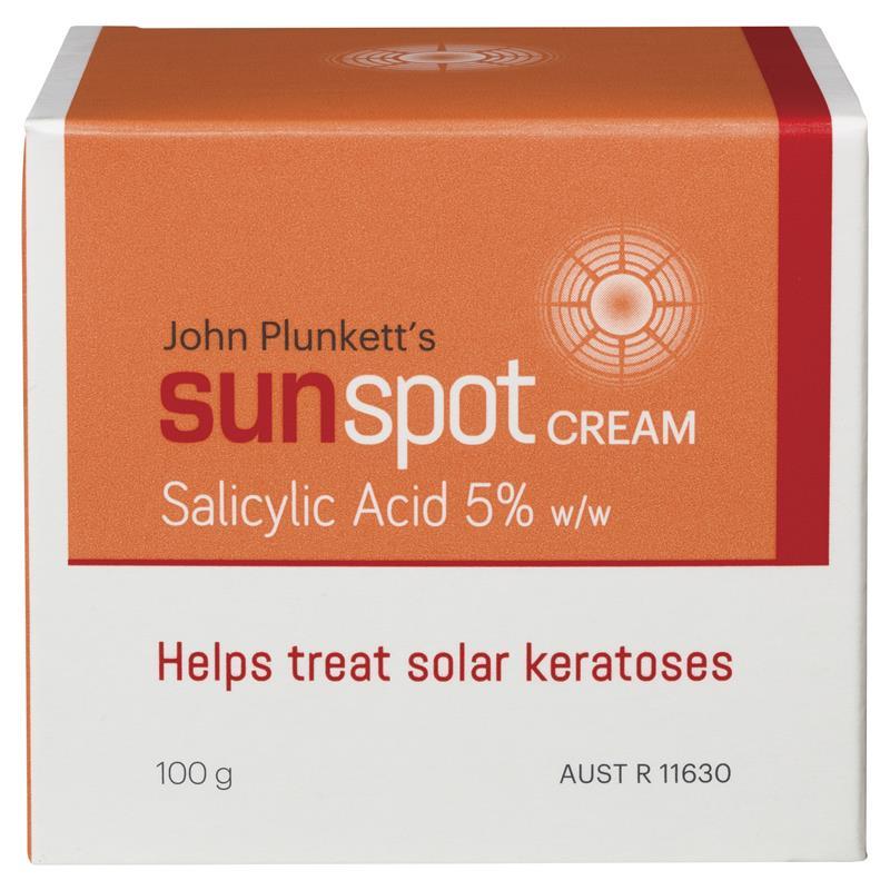 General Information John Plunkett's Sunspot Cream helps treat solar keratoses. It aids in removing sunspots or solar keratoses which is hard or rough skin found on the backs of hands, arms, face, ears and scalp. The cream works gradually to soften and remove the unwanted skin tissue with results appearing after 4 weeks. How Does Sunspot Cream Work? • Sunspot Cream is an exclusive formula that works gradually to remove the sun damaged layers of skin. • These layers are then replaced by healthy new skin. • Its ingredients assist in nourishing and restoring skin to a clear condition. Suitable For: Treatment of solar keratosis (sunspots). Sunspots are usually rough and raised and either red or white in colour. Product Claims: Helps treat solar keratosis (sunspots). Vegan Friendly. Boxed Contents: Yes Size: 100g KEY FEATURES • • 5% Salicylic Acid: Gradually removes sun damaged layers of skin and encourages renewal and revitalisation of skin cells • • Urea: A powerful moisturizing ingredient that helps skin stay smooth and soft. • • Painless and non-invasive alternative to liquid nitrogen removal • • No burning or stinging sensation • • May be applied under make-up. • • Outcome: Gently and gradually helps remove Solar Keratoses, leaving smooth, unblemished skin with results appearing after 4 weeks.