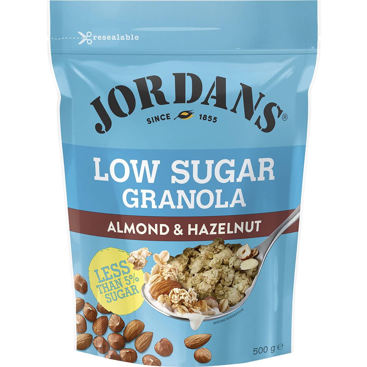 Jordans Low Sugar Granola Almond & Hazelnut is toasted whole grain oat and barley clusters with sliced & whole almonds and roasted chopped hazelnuts, and contains less than 5% sugar.Our Jordans family have been milling since 1855. We've always been passionate about natural ingredients, creating tasty recipes, and making incredible cereals. We've focussed this passion for ingredients and knowledge of blending to ensure every spoonful contains the perfect balance of whole grain oats and the tasty natural extras. It's just what you need to help kick start your day!  That's why we've been working hard to reduce it. It's been a tricky thing to do, as sugar helps create the crunchy texture and taste we know you love. But with no artificial colours or preservatives, and with the help of chicory root fibre, we've created this granola with less than 5% sugar.Blended with hazelnuts and almonds we think it tastes pretty good too. So now there's even more reasons to enjoy our tasty crunchy clusters.No artificial colours or preservativesWhole grain oatsSuitable for vegetariansSource of fibreLess than 5% sugar