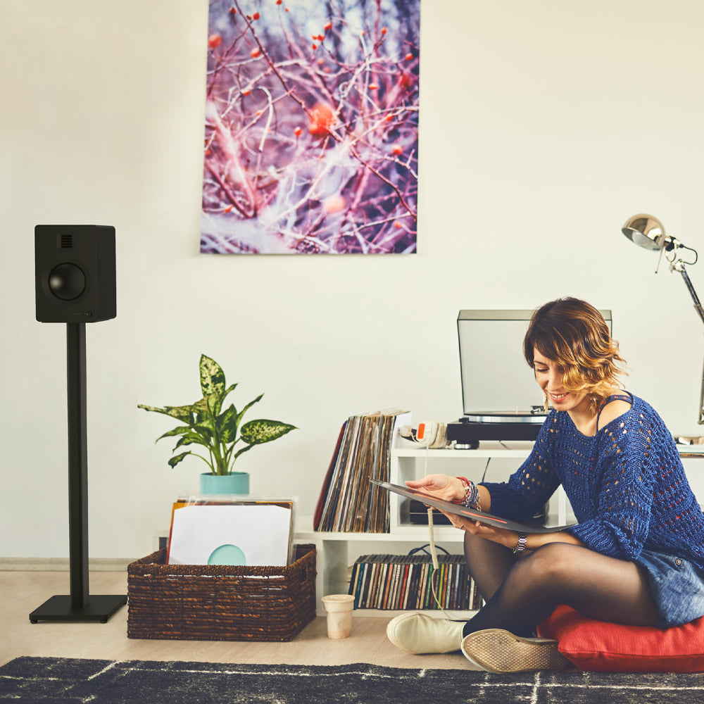 Kanto ST34 34" Universal Bookshelf Speaker Floor Stand - Black, Pair -Get the most out of your speakers by placing them at ear level and away from surfaces that can cause unwanted sound reflections. The Kanto ST28 and ST34 floor speaker stands are purpose-built for bookshelf and standmount speakers weighing up to 13.6 kg (30 lbs). Constructed with durable steel columns and a weighted MDF base, they offer reliable stability and improved acoustic performance. These stands come with adjustable rubber feet for hard floors and carpet spikes for secure positioning on carpet. An integrated cable management system keeps cords neat and tucked away, helping maintain a clean, clutter-free look. With a sleek and timeless black finish, ST-series stands fit seamlessly into any Aussie home setup. Sold as a pair and available in both 28” (71 cm) and 34” (86 cm) heights. Key Features: -Improved Audio Performance – Align your speakers with your ears and minimise sound reflections from walls and furniture to enjoy clearer, more accurate sound. -Classic, Minimalist Look – A sleek, understated design that complements any room. Available in 28” or 34” height options with a black finish. -Neat and Tidy – Built-in cable management lets you run speaker and power cables through the centre column, keeping things neat and trip-free. -Built to Last – Heavy-duty steel tubing provides solid support and reduces vibration, supporting speakers up to 13.6 kg each. -Versatile on Any Surface – Comes with height-adjustable rubber feet and carpet spikes so you can set up securely on timber, tiles, or carpeted floors.