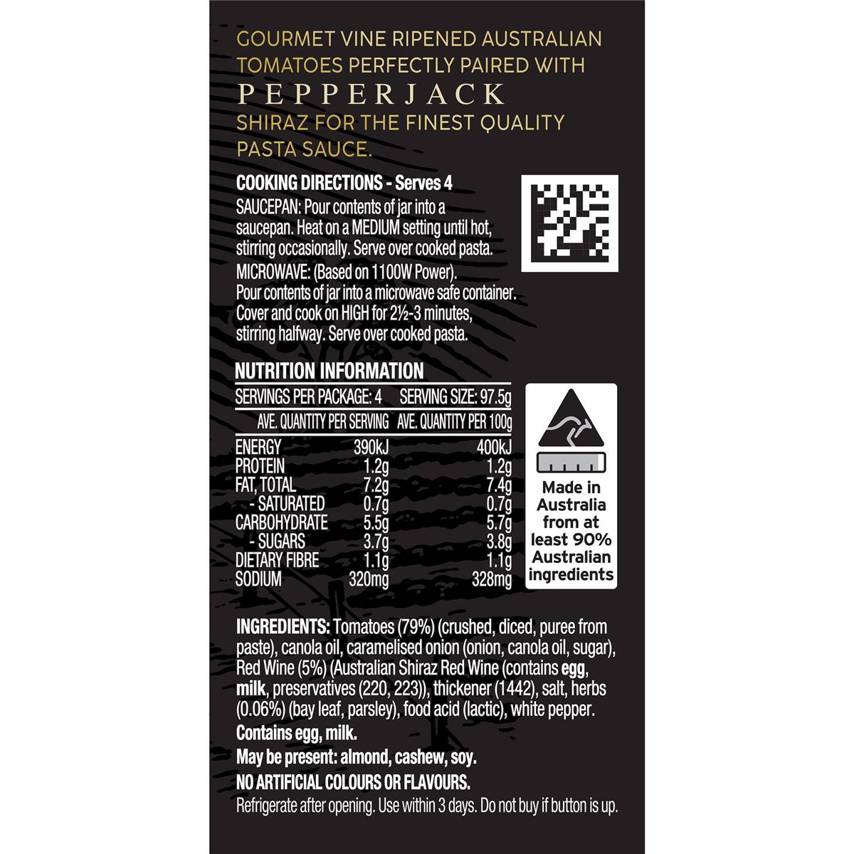 A gourmet pasta sauce made with Australian grown tomatoes, vine ripened and combined with vibrant herbs, and perfectly paired with a bold Pepperjack Shiraz for the finest quality pasta sauce. The perfect choice for Australians seeking a premium and convenient pasta sauce to elevate the everyday meal.- Made in partnership with Pepperjack Barossa Shiraz- Made with Australian tomatoes- No Artificial Colours or Flavours- Serves 4Add Leggo’s Gourmet Pasta Sauce Tomato & Pepperjack Barossa Shiraz to a saucepan and stir over a medium heat until hot, then serve with your favourite cooked pasta. Join us in celebrating the best of Australian ingredients, indulging in the taste of quality and tradition, and supporting local Australian farmers and food producers.When it comes to Italian food, Aussies love to do it their way - Leggo’s are here to celebrate Aussie twists on classic Italian recipes! Leggo's has been Australian made with quality ingredients for over 130 years – It’s How We Do Italian.