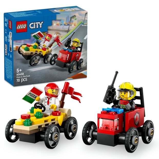 58,Treat your race fan to the LEGO® City Pizza vs. Fire Truck Race Car Pack (60458) for kids aged 5 and over. This fun racing set features 2 soapbox race cars and 2 minifigures. Kids can pit the chef in the sizzling pizza slice against the firefighter in the red-hot fire truck. Who’ll win? Take your seat for epic urban race action!