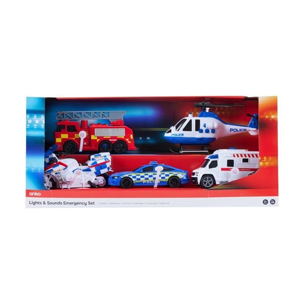 Product DetailsSuitable for ages: 3+ yearsIncludes 1 x ambulance, 1 x fire truck, 1 x helicopter, 1 x motorcycle and 1 x police carDimensions/Size: 21cm (H) x 47cm (W) x 18cm (D)Battery information:Each vehicle: Requires 2 x 1.5V AAA batteries (included)Total: Requires 10 x 1.5V AAA batteries (included)Colour: White, blue, red, black, grey and yellow