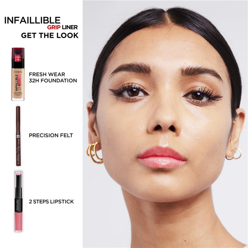 General Information Line your eyes with Infaillible 27H Grip Precision Felt Liner by L'Oreal Paris. This waterproof eyeliner provides you with the following features: >> 0.4mm soft felt tip for easy precision and application >> High intensity eyeliner available in two colours, >> Easy grip zone for smooth and precise application >> 27h long lasting, transfer-proof, waterproof, smudge-proof In one steady stroke, the L'Oreal Paris Infallible Grip Precision Felt liquid liner enhances your eye look with its 0.4mm precise tip. Providing bold and saturated strokes, this accurate, thin eyeliner guarantees maximum control thanks to its grip zone. An eyeliner makeup with 27h Infaillible wear, that is waterproof, smudge-proof, transfer-proof. Size: 1 Unit KEY FEATURES • Precise application • High intensity colour • 27H long lasting • Transfer Proof