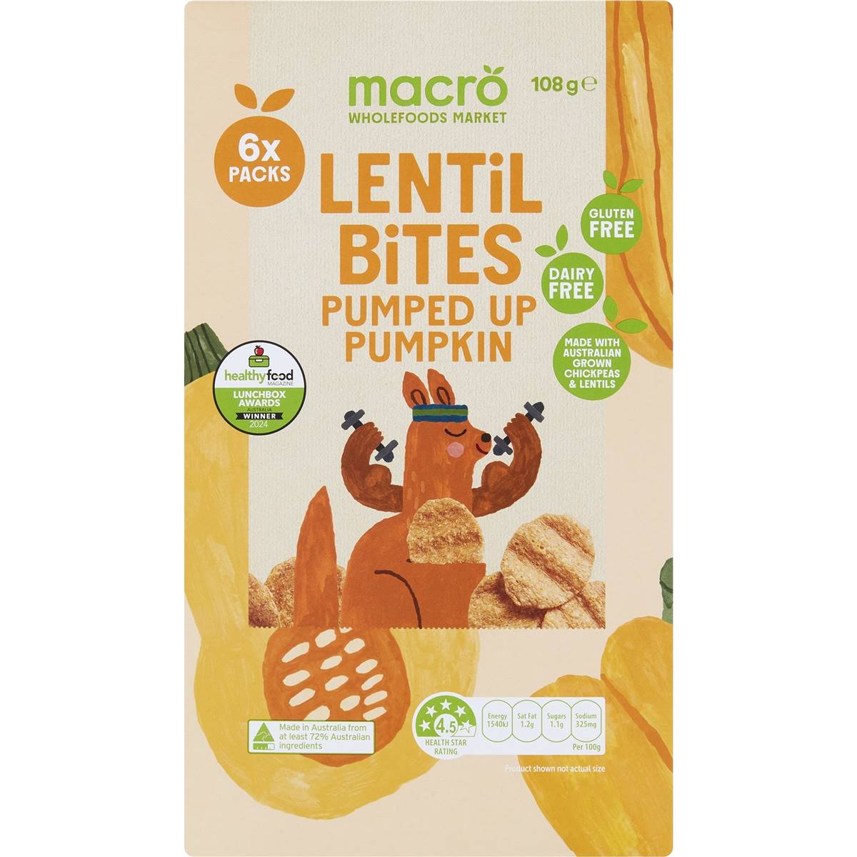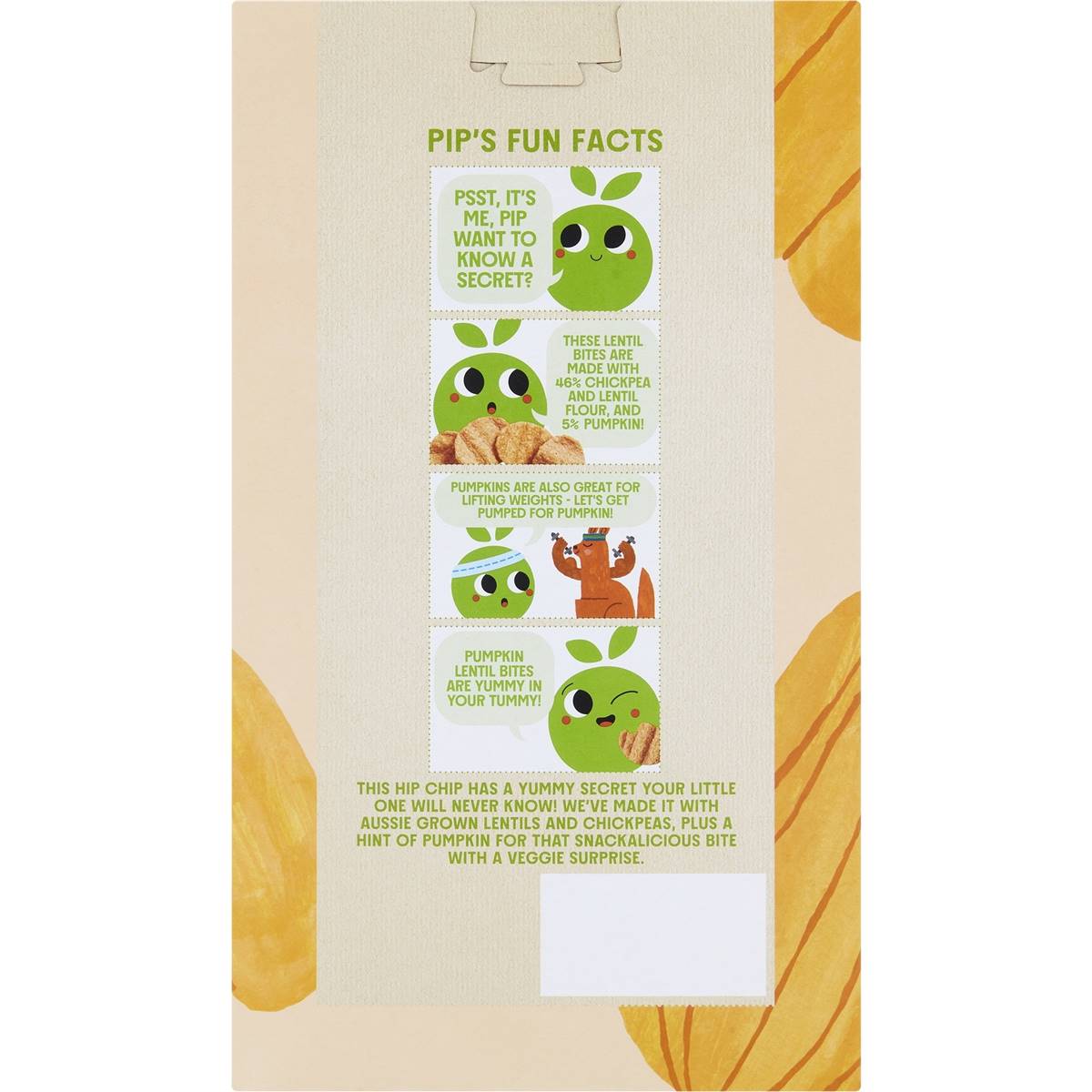 Pip's fun facts Psst, it's me, Pip Want to know a secret? These lentil bites are made with 46% chick??? and lentil flour, and 5% pumpkin! Pumpkins are also great for lifting weights - let's get pumped for pumpkin! Pumpkin lentil bites are yummy in your tummy! This hip chip has a yummy secret your little one will never know! We've made it with Aussie grown lentils and chickpeas, plus a hint of pumpkin for that snackalicious bite with a veggie surprise.