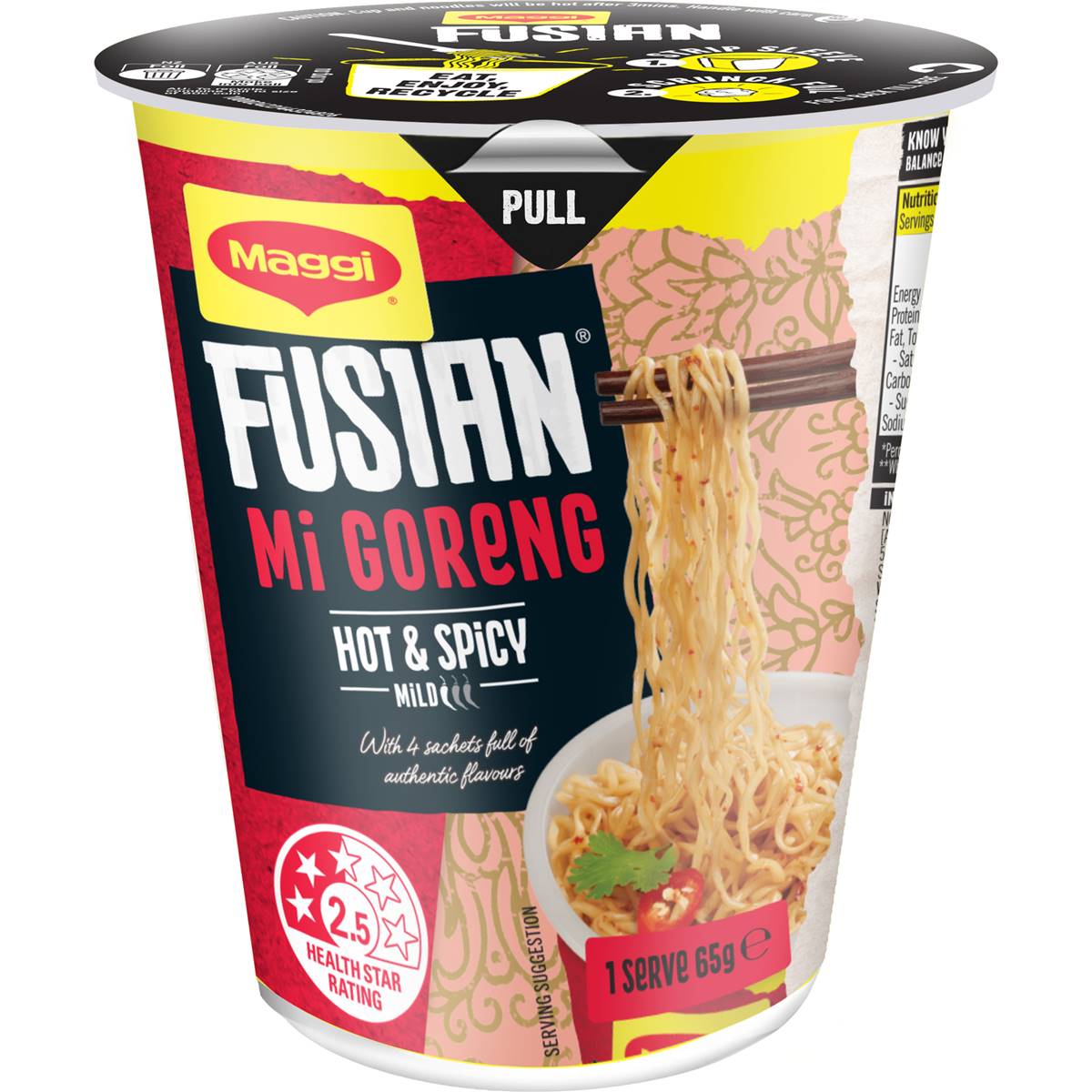 MAGGI FUSIAN Noodles Mi Goreng Hot & Spicy Flavour Noodle Cups will take you on a flavour adventure! With authentic Asian style spices in every mouthful, these instant noodles are perfect for those who enjoy a bit of spice in their life! Tailor the flavour and heat to your preference by creating your perfect combo of the included sweet soy sauce, seasoning oil, spice mix and chilli sachets.Perfect for on-the-go, simply open the lid, add in boiling water, wait 3 minutes, drain carefully, add in the flavour sachets, stir and enjoy.