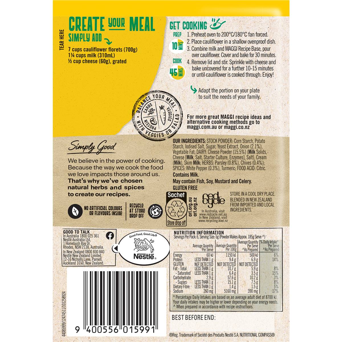 MAGGI Cheesy Cauliflower Bake Recipe Base helps create the perfect side dish to add to your next family dinner! Made with natural herbs and spices, this Recipe Base makes it easier than ever to serve up a delicious family meal. Simply add caulifower, milk and cheese to create this tasty vegetable side.For a balanced meal, be sure to fill half your plate with vegetables and salad.Love this side dish? Check out the rest of the MAGGI Recipe Base range!Simple, convenient and tastySimply add 3 key ingredients to create the perfect side for your next family dinner!Made with natural herbs and spices