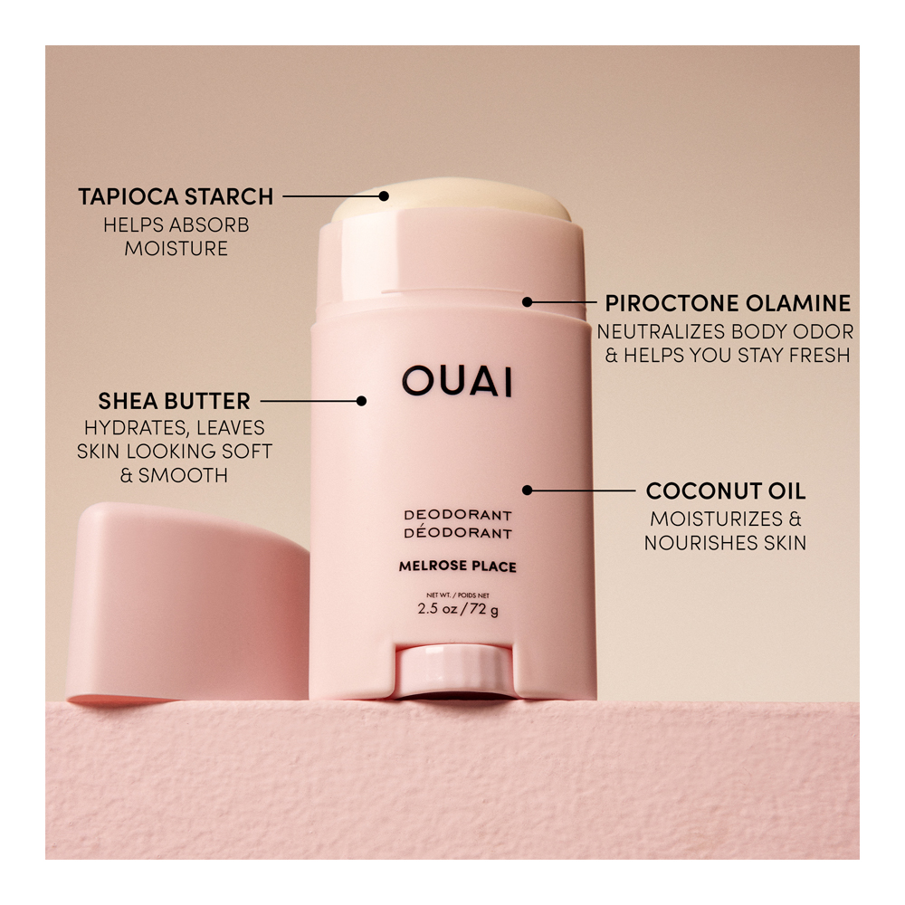 Twist up 3x. Swipe once onto clean, dry skin. A little goes a long OUAI. Let it dry before getting dressed to avoid transfer. Twist down 3x before replacing the cap. Reapply as needed—especially post-workout or on hot days. Use daily for best results. Like skincare, consistency is key. Wearing antiperspirant? Layer OUAI DEODORANT on top for an extra hit of fragrance + freshness.