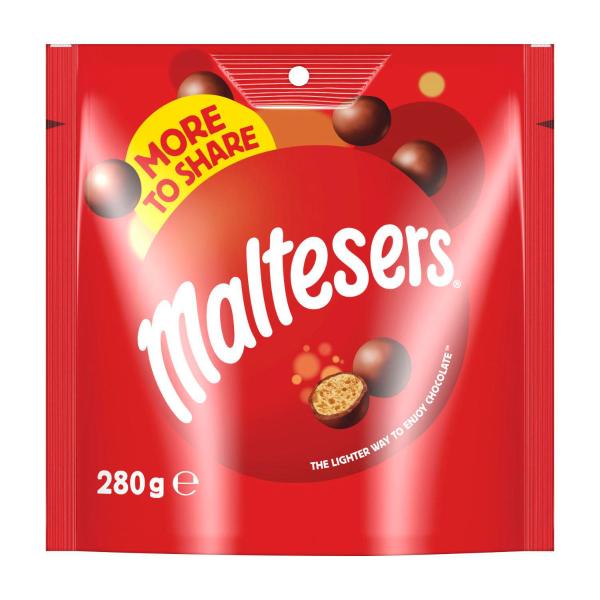 Maltesers Contain Milk Chocolate 75%, Malt Centre 23%. Ingredients: Sugar, MILK Solids, Cocoa Butter, Cocoa Mass, Malt Extract (BARLEY), Glucose Syrup, Vegetable Fat, Maltodextrin, Emulsifiers (SOY Lecithin, 492), Raising Agents (501, 500), Vegetable Gum (440), Salt, Flavour. Milk Chocolate Contains Cocoa Solids 25%, Milk Solids 23%.