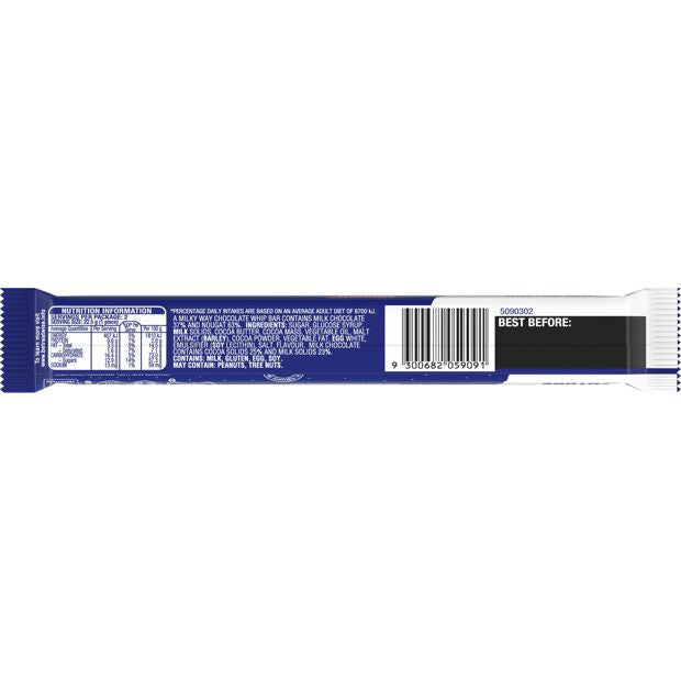 Product DetailsNet weight: 45gIncludes a 45g bar of Milky Way Chocolate WhipIngredients: Sugar, Glucose Syrup (Sources Include Wheat), Milk Solids, Cocoa Mass, Cocoa Butter, Vegetable Oil, Barley Malt Extract, Vegetable Fat, Egg White, Emulsifier (Soy Lecithin), Salt and Natural Flavour (Vanilla Extract)Allergen information: Contains milk, gluten, egg and soy. May contain peanuts and tree nutsMade in AustraliaFeatures2 shareNo artificial colours or flavoursAdditional InformationNote: Store in a cool dry place.Disclaimer: All reasonable efforts have been made to ensure that the ingredient list for this product is accurate, up-to-date and complete.