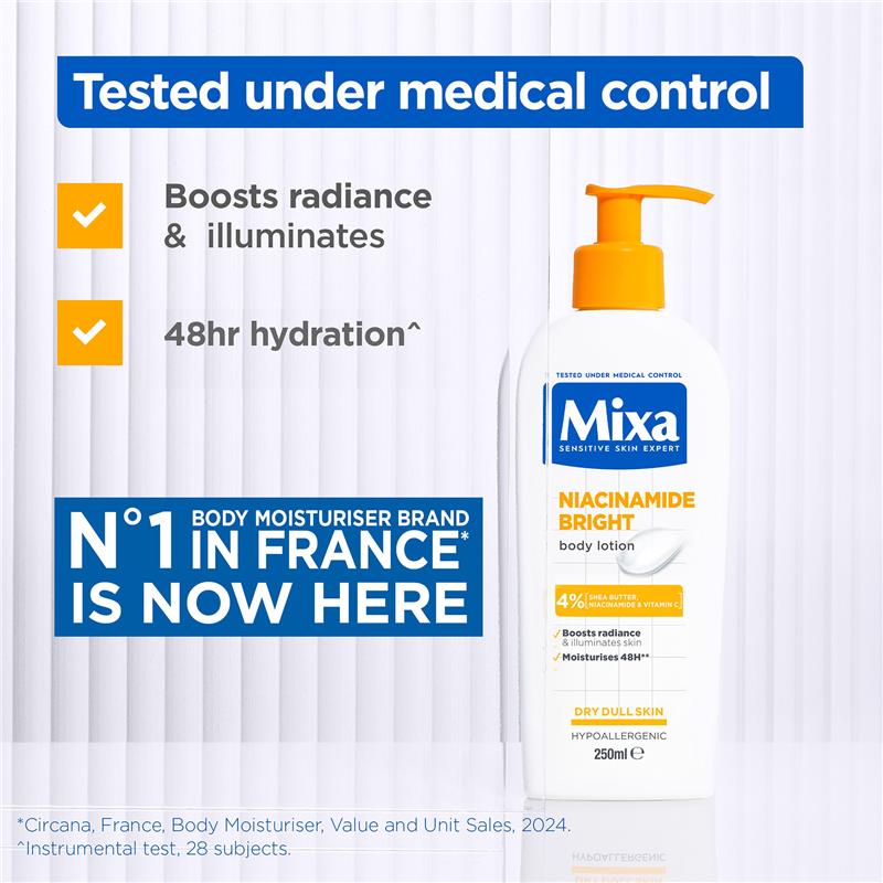 General Information Our Niaciamide Bright Body Lotion visibly fades dark spots & corrects uneven skin tone for dull, dry, uneven skin. Formulated with 4% Shea Butter, Niacinamide & Vitamin C, it provides hydration for 48hr's*. **Instrumental test on 28 subjects. Dry, dull skin needs highly moisturising and brightening care that is non-greasy, fast absorbing and gentle for even the most sensitive skin. Our Niaciamide Bright Body Lotion visibly fades dark spots & corrects uneven skin tone for dull, dry, uneven skin. Formulated with 4% Shea Butter, Niacinamide & Vitamin C, it provides hydration for 48hr's*. **Instrumental test on 28 subjects. Size: 250ml Fragrance: NA KEY FEATURES • 48hr hydration* **Instrumental test on 28 subjects. • FORMULATED WITH POWERFUL INGREDIENTS SUITABLE FOR SENSITIVE SKIN: SHEA BUTTER: Known to deeply nourish the skin. NIACINAMID: Known to improve radiance and hydration. VITAMIN Cg: A derivative of Vitamin C known to improve skin tone evenness. • TESTED UNDER MEDICAL CONTROL • SCIENTIFICALLY PROVEN RESULTS • HYPOALLERGENIC FORMULA & 100% TESTED ON SENSITIVE SKIN