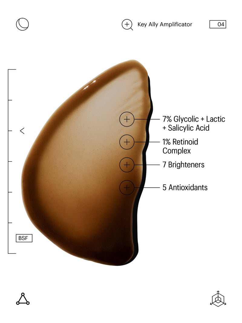 7% GLYCOLIC + LACTIC + SALICYLIC ACID. This blend of AHAs (Alpha Hydroxy Acids) and Salicylic Acid gently sweeps away dead cells from the skin’s top layer, unclogging pores and reducing the appearance of blemishes and blackheads while hydrating and strengthening the skin’s barrier.. . 1% RETINOID COMPLEX. Retinoid is a general term used to describe Vitamin A, an ingredient that promotes skin renewal and enhances collagen production. It comes in many forms and strength percentages, including Retinal, Retinoic Acid, or Retinyl Palmitate. Retinoid-based products increase cellular turnover and promote collagen production, helping to even out skin tone and smooth fine lines.