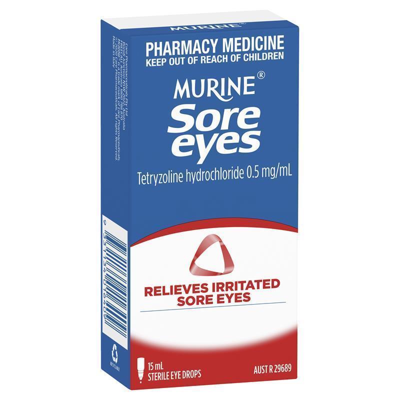 General Information MURINE® Sore Eyes Drops relieves irritated sore eyes. Relieves burning eyes and strained eyes. MURINE® Sore eyes relieves minor eye irritation and redness caused by plant allergies (pollen), fatigue, swimming, colds, smog, wind and eye strain from reading, driving, television and close work. Suitable For: Irritated sore eyes Boxed Contents: 15ml Drops Size: 15mL KEY FEATURES • Relieves sore irritated eyes