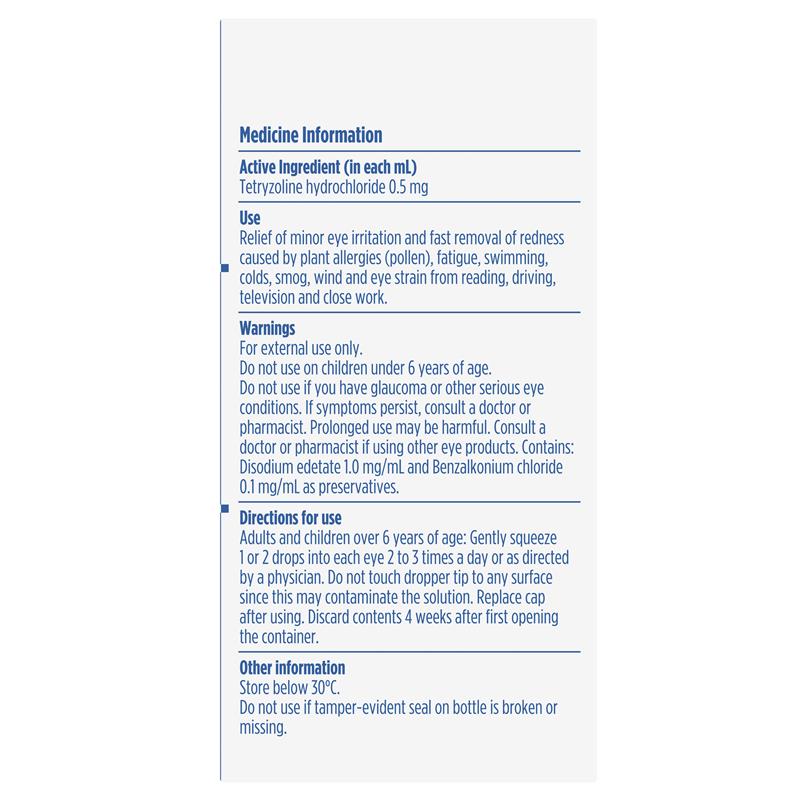 Ingredients Disodium edetate 1.0 mg/mL and Benzalkonium chloride 0.1 mg/mL as preservatives. Tetryzoline hydrochloride 0.5mg/mL Contains: Disodium edetate 1.0 mg/mL and Benzalkonium chloride 0.1 mg/mL as preservatives.