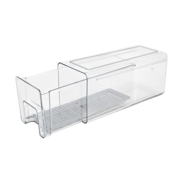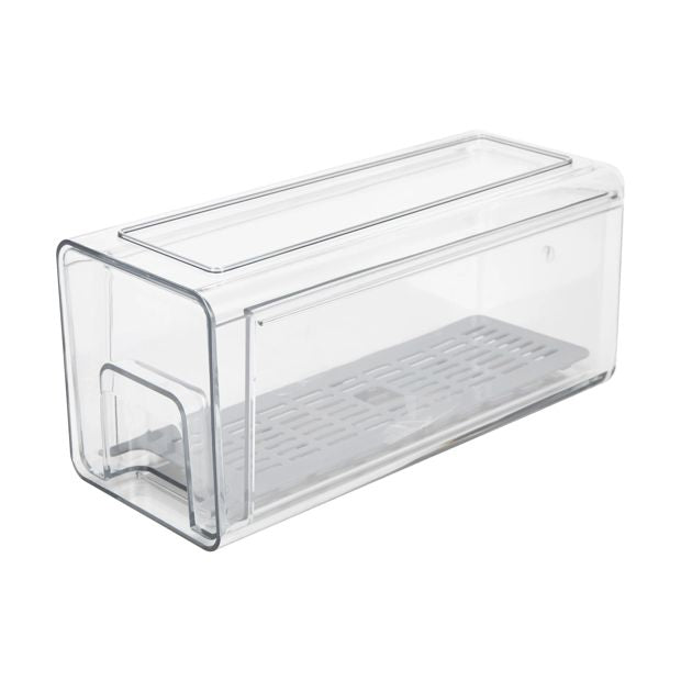 Product DetailsDimensions/Size: 11.2cm (H) x 10.5cm (W) x 25cm (D)Colour: Clear and greyFeaturesNarrow designRemovable inner tray to maintain airflow and keep food fresher for longerBPA freeFreezer safeStackable