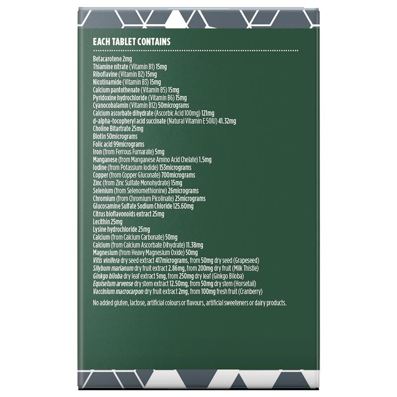 Ingredients Each tablet contains: Betacarotene 2mg Thiamine nitrate (Vitamin B1) 15mg Riboflavine (Vitamin B2) 15mg Nicotinamide (Vitamin B3) 15mg Calcium pantothenate (Vitamin B5) 15mg Pyridoxine hydrochloride (Vitamin B6) 15mg Cyanocobalamin (Vitamin B12) 50micrograms Calcium ascorbate dihydrate (Ascorbic Acid 100mg) 121mg d-alpha-tocopheryl acid succinate (Natural Vitamin E 50IU) 41.32mg Choline Bitartrate 25mg Biotin 50micrograms Folic acid 99micrograms Iron (from Ferrous Fumarate) 5mg Manganese (from Manganese Amino Acid Chelate) 1.5mg Iodine (from Potassium Iodide) 153micrograms Copper (from Copper Gluconate) 700micrograms Zinc (from Zinc Sulfate Monohydrate) 15mg Selenium (from Selenomethionine) 26micrograms Chromium (from Chromium Picolinate) 25micrograms Glucosamine Sulfate Sodium Chloride 125.60mg Citrus bioflavonoids extract 25mg Lecithin 25mg Lysine hydrochloride 25mg Calcium (from Calcium Carbonate) 50mg Calcium (from Calcium Ascorbate Dihydrate) 11.38mg Magnesium (from Heavy Magnesium Oxide) 50mg Vitis vinifera dry seed extract 417micrograms, from 50mg dry seed (Grapeseed) Silybum marianum dry fruit extract 2.86mg, from 200mg dry fruit (Milk Thistle) Ginkgo biloba dry leaf extract 5mg, from 250mg dry leaf (Ginkgo Biloba) Equisetum arvense dry stem extract 12.50mg, from 50mg dry stem (Horsetail) Vaccinium macrocarpon dry fruit extract 2mg, from 100mg fresh fruit (Cranberry) Contains: No added gluten, lactose, artificial colours or flavours, artificial sweeteners, or dairy products. Allergen Contains: Soybean| Sulphites| Crustacean