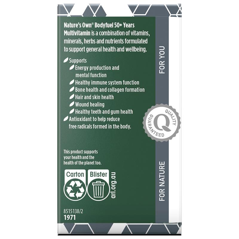 General Information Is a combination of vitamins, minerals, herbs and nutrients formulated to support general health and wellbeing. For a multivitamin formulated for seniors 50+ that maintains energy production with one tablet daily, try Nature’s Own Bodyfuel 50+ Multivitamin Tablets. Formulated with a combination of vitamins, minerals, herbs & nutrients to support the general health of adults 50+, Nature’s Own Bodyfuel 50+ Multivitamin supports healthy teeth and bones and healthy immune system function, while also reducing free radicals formed in the body. Plus, Nature’s Own Bodyfuel 50+ Multivitamin helps with wound-healing and to maintain healthy hair, skin, and nails. Australian Made® and rigorously tested to ensure quality, potency, and purity, Nature’s Own Bodyfuel 50+ Multivitamin contains no added gluten, lactose, artificial colours or flavours, artificial sweeteners, or dairy products. Adults, take 1 tablet daily with food or as recommended by your healthcare professional. Always read the label and follow the directions for use. Vitamins and supplements should not replace a balanced diet. Suitable For: Adults: Take 1 tablet daily with food or as recommended by your healthcare professional. Product Claims: Nature's Own Bodyfuel 50+ Years Multivitamin is a combination of vitamins, minerals, herbs and nutrients formulated to support general health and wellbeing. Size: 60 Tablets KEY FEATURES • IMMUNE SUPPORT: Supports healthy immune system function and wound healing • ANTIOXIDANT: Reduces free radicals formed in the body • BONE HEALTH: Helps support healthy bones, teeth, and gums • FOR ADULTS 50+: Vitamins, minerals, herbs & nutrients to support the general health of adults 50+ • MAINTAIN COLLAGEN FORMATION & SKIN HEALTH: Supports collagen formation and healthy skin, hair, and nails • Always read the label and follow the directions for use. See product warnings below