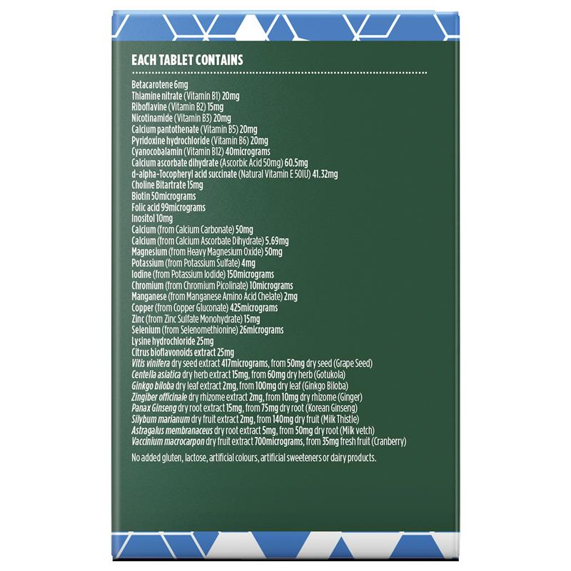 Ingredients Each tablet contains: Betacarotene 6mg Thiamine nitrate (Vitamin B1) 20mg Riboflavine (Vitamin B2) 15mg Nicotinamide (Vitamin B3) 20mg Calcium pantothenate (Vitamin B5) 20mg Pyridoxine hydrochloride (Vitamin B6) 20mg Cyanocobalamin (Vitamin B12) 40micrograms Calcium ascorbate dihydrate (Ascorbic Acid 50mg) 60.5mg d-alpha-Tocopheryl acid succinate (Natural Vitamin E 50IU) 41.32mg Choline Bitartrate 15mg Biotin 50micrograms Folic acid 99micrograms Inositol 10mg Calcium (from Calcium Carbonate) 50mg Calcium (from Calcium Ascorbate Dihydrate) 5.69mg Magnesium (from Heavy Magnesium Oxide) 50mg Potassium (from Potassium Sulfate) 4mg Iodine (from Potassium Iodide) 150micrograms Chromium (from Chromium Picolinate) 10micrograms Manganese (from Manganese Amino Acid Chelate) 2mg Copper (from Copper Gluconate) 425micrograms Zinc (from Zinc Sulfate Monohydrate) 15mg Selenium (from Selenomethionine) 26micrograms Lysine hydrochloride 25mg Citrus bioflavonoids extract 25mg Vitis vinifera dry seed extract 417micrograms, from 50mg dry seed (Grape Seed) Centella asiatica dry herb extract 15mg, from 60mg dry herb (Gotukola) Ginkgo biloba dry leaf extract 2mg, from 100mg dry leaf (Ginkgo Biloba) Zingiber officinale dry rhizome extract 2mg, from 10mg dry rhizome (Ginger) Panax Ginseng dry root extract 15mg, from 75mg dry root (Korean Ginseng) Silybum marianum dry fruit extract 2mg, from 140mg dry fruit (Milk Thistle) Astragalus membranaceus dry root extract 5mg, from 50mg dry root (Milk vetch) Vaccinium macrocarpon dry fruit extract 700micrograms, from 35mg fresh fruit (Cranberry) Contains: No added gluten, lactose, artificial colours, artificial sweeteners or dairy products. Allergen Contains: Soybean| Sulphites