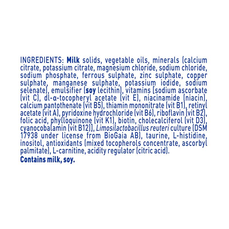 Ingredients Milk solids, vegetable oils, minerals (calcium citrate, potassium citrate, magnesium chloride, sodium chloride, sodium phosphate, ferrous sulphate, zinc sulphate, copper sulphate, manganese sulphate, potassium iodide, sodium selenate), emulsifier (soy lecithin), vitamins [sodium ascorbate (vit C), dl-a-tocopheryl acetate (vit E), niacinamide (niacin), calcium pantothenate (vit B5), thiamin mononitrate (vit B1), retinyl acetate (vit A), pyridoxine hydrochloride (vit B6), riboflavin (vit B2), folic acid, phylloquinone (vit K1), biotin, cholecalciferol (vit D3), cyanocobalamin (vit B12)], limosilactobacillus reuteri culture (DSM 17938 under license from BioGaia AB), taurine, L-histidine, inositol, antioxidants (mixed tocopherols concentrate, ascorbyl palmitate), L-carnitine, acidity regulator (citric acid). Allergen Contains: Soy| Milk