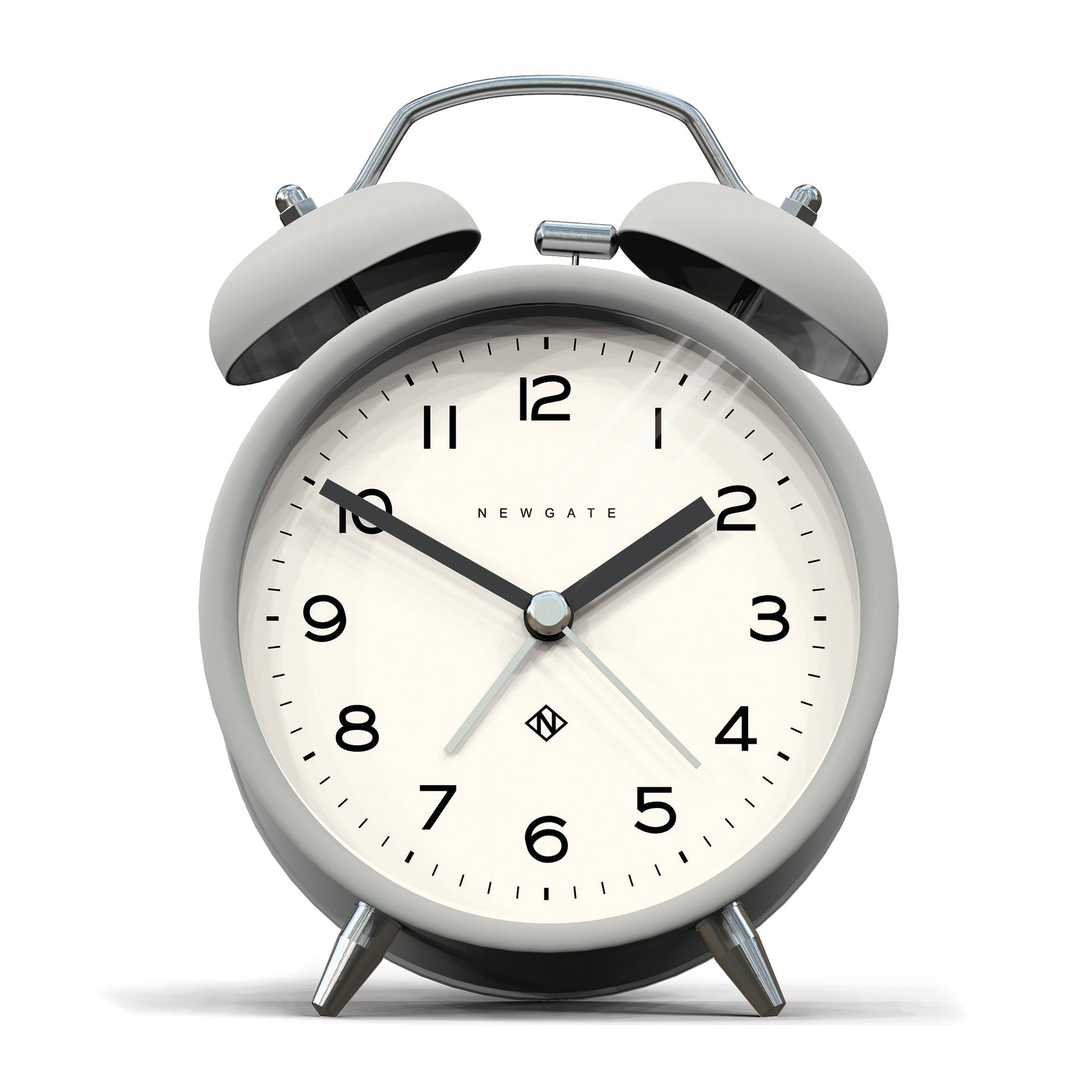 Newgate Charlie Bell Echo Matte Posh Grey A modern grey alarm clock with a contemporary graphic dial and a moving hammer and twin-bell alarm. Known as silent sweep in the industry, the hands move in a constant sweeping motion rather than a stepped tick. So you won't hear any ticking but if your hearing is particularly sensitive in a completely silent room you may hear a very quiet whirring. - Material: Metal, Acrylic, Paper, Glass- Colour: Grey- Movement: Quartz- Power: 1 x AA (not included)- Dimensions: LWH 5.5 x 9.8 x 13.5cm- Weight: 0.22kg