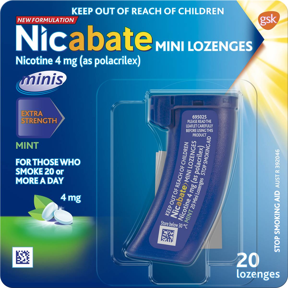 Nicabate Mini Lozenges Extra Strength Nicotine 4mg Mint is the stop smoking aid for those who smoke 20 or more cigarettes a day. Nicabate Lozenges fight nicotine cravings.Nicabate Minis contain nicotine to relieve cravings. Craving control that allows you to quit smoking, at a pace that suits you, to help you stay calm, be prepared and in control of your quit journey.Nicabate Minis are small lozenges that release therapeutic nicotine quickly to help you quit smoking. Each time you avoid reaching for a cigarette, feel proud of yourself and celebrate that little win. Available in both 2mg and 4mg strength; 4mg strength is for those who smoke 20 or more cigarettes a day and 2mg strength is for those who smoke less than 20 cigarettes a day.Nicabate Minis come in a pocket-sized pack to make it easy to keep with you. Use Nicabate Minis for craving control and relieve sudden nicotine cravings, anytime, anywhere. They are a form of nicotine replacement therapy (NRT).Nicabate Minis provide craving control: Helping you stay strong and relieve sudden cravings anywhere, any time.- Pocket-sized pack is easy to keep with you- Small quit smoking lozenges- Fresh and discreet- Releases therapeutic nicotine- On the go craving control to help you quit smoking- For effective craving control, think small- Nicotine replacement therapy (NRT)Helps relieve sudden cravings fast**4mg only. Craving relief in as little as 3 minutesPocket-sized pack is easy to keep with youSmall quit smoking lozengesFresh and discreetOn the go craving control to help you quit smoking