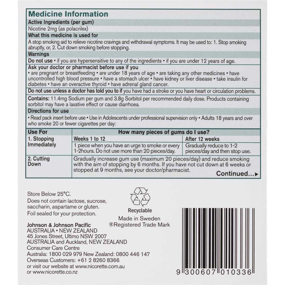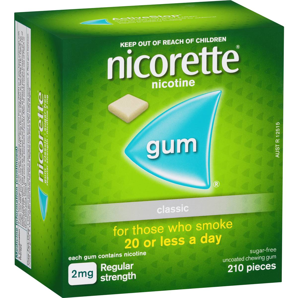 Nicorette Nicotine Gum Uncoated Regular Strength 2mg Classic 210 pack. Use as a quit smoking aid.Nicorette Nicotine Gum Regular Strength Uncoated 2mg is a quit-smoking aid. Sugar free Actively Fights Cravings Regular strength 2mg nicotine gum is suitable for those who smoke less than 20 cigarettes a day Classic uncoated nicotine gum Discreet craving relief Nicorette Gum works by relieving nicotine cravings and withdrawal symptoms. It may be used to: 1. Stop smoking abruptly, or, 2. Cut down smoking before stopping. Use nicotine gum with ActiveStop supporting you, body & mind. Visit theNicorette website for additional support in stopping smoking and information on other quit smoking products. This quit smoking gum can also be used in conjunction with other nicotine replacement therapy (NRT) products for better craving relief. Sugar FreeRegular Strength 2mgClassic Flavour210 PiecesDiscreet Craving Relief