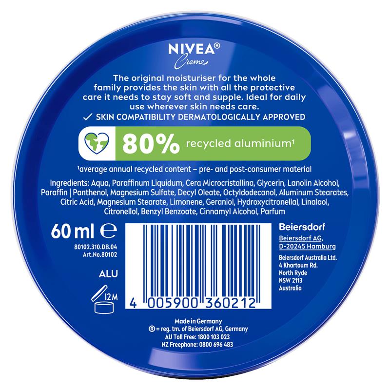 General Information Get the intensive care you need with the classic NIVEA Creme, the original moisturiser for the whole family. The rich formula has been a staple of the NIVEA brand since the beginning. With its many uses wherever your skin needs, you can have soft, smooth skin anytime. NIVEA Creme is the original moisturiser for the whole family. This iconic cream is built on 100 years of trusted NIVEA skincare expertise. Enriched with the skin related Eucerit®, NIVEA Crème provides the skin with all the protective care it needs to stay soft and supple. Ideal for daily use whenever and wherever your skin needs a little extra care - face, hands, body, you name it! This lotion hydrates and soothes the skin with each use, providing intense moisture for every skin type, even sensitive skin. The skin compatibility of this moisturiser has been dermatologically tested and approved. Size: 60mL Dermatologically Approved?: Yes Soap-Free?: No Skin Type: Combination Alcohol Free?: Yes KEY FEATURES • 1|Effective Results: intensive protective care • 2|Multi-Use: for face, body and hands • 3|Rich Formula: soft, soothing and moisturising • 4|Quality Ingredients: enriched with the skin related Eucerit® • 5|Usage: perfect for everyday use to boost your skin's hydration • 6|Suitable for all skin types: Skin tolerance dermatologically proven