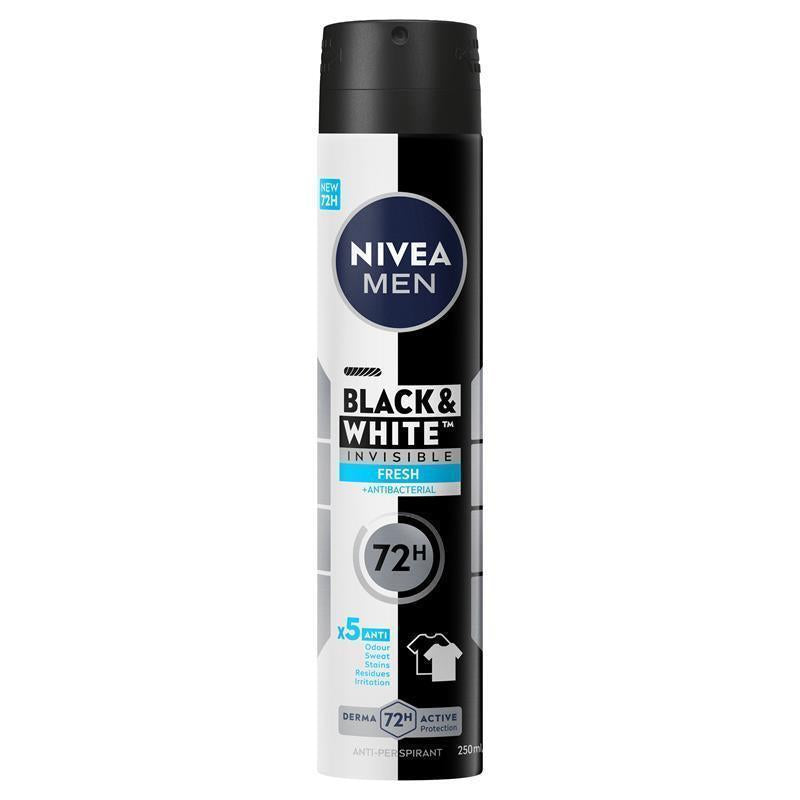General Information NIVEA MEN BLACK & WHITE INVISIBLE range provides white mark protection on black clothing & anti-yellow staining on white clothing thanks to it's unique patented anti-stains technology. It is a reliable 72h anti-perspirant protection, strong on sweat and odours, that cares for your skin. NIVEA MEN BLACK & WHITE INIVISIBLE range offers powerful anti-perspirant protection without the risks of white marks on black clothing and yellow stains on white clothing. By using anti-stain technology, NIVEA MEN BLACK & WHITE is able to protect the textile fibres before stain components can reach and penetrate them. The unique formula protects you for 72 hours against sweat, odors, stains, residues and irritations, while being gentle on the skin. Say Goodbye to white and yellow stains on your clothes The formulas skin tolerance are dermatologically proven and do not contain ethyl alcohol. Our anti-perspirants offer Derma 72h Active protection: our products are working with the skin, for reliable and strong efficacy against sweat and odour and with kind-to-skin formulations. Get the reliable protection and care that you deserve! Also available in a roll-on format. Size: 250ml KEY FEATURES • White mark protection on black clothing & anti-yellow staining on white clothing • Reliable 72h anti-perspirant protection that cares for your skin • Clean & fresh skin feeling • x5 Anti: Odour, Sweat, Stains, Residues, Irritation • DERMA 72H ACTIVE PROTECTION • No ethyl alcohol • Skin tolerance dermatologically proven