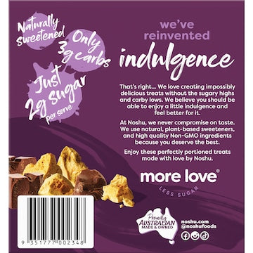 We've reinvented indulgence That’s right... We love creating impossibly delicious treats without the sugary highs and carby lows. We believe you should be able to enjoy a little indulgence and feel better for it. At Noshu, we never compromise on taste. We use natural, plant-based sweeteners, and high quality Non-GMO ingredients because you deserve the best. Enjoy these perfectly portioned treats made with love by Noshu. More Love. Less Sugar.