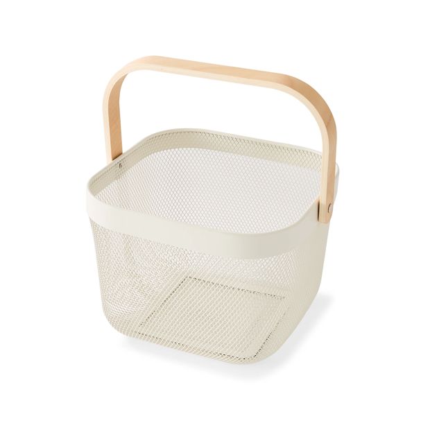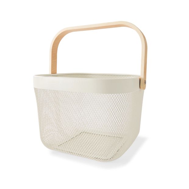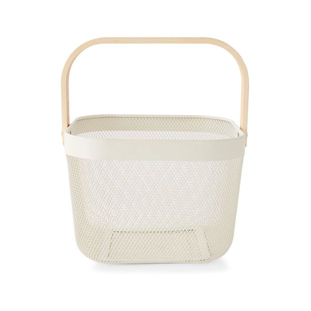 Product DetailsDimensions/Size: 18cm (H) x 24.5cm (W) x 24.5cm (D)Maximum weight capacity: 3kgColour: Off-whiteFeaturesMesh detailTop carry handle