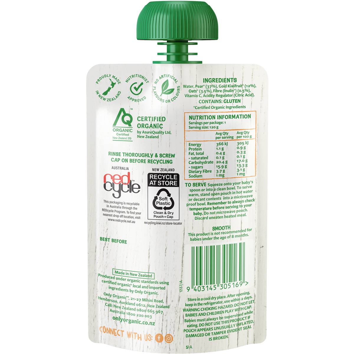 Only Organic Pear Gold Kiwifruit & Oats With Prebiotics 8+ Months 120g