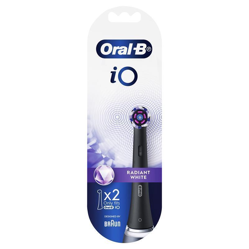 General Information iO Series Radiant White Electric Toothbrush Refills for Oral-B iO Series Electric Toothbrushes, Black, 2 Pack The iO collection combines powerful, but gentle micro-vibrations with Oral-B's unique dentist-inspired round brush head design for a professional clean feeling every day. Radiant White Refills help whiten teeth starting from day 1* *by removing surface stains. Precisely angled bristles lift and remove plaque. #oralb #oral-b #electrictoothbrush #toothbrush #toothpaste #floss #mouthwash #teethwhitening #refills #whitening #clean #fresh #charger #travel #kids #crossaction #colour #gum #sensitive #enamel #white #black #rose #blue #pink #mint Boxed Contents: 2 pack KEY FEATURES • Advanced cleaning and whitening starting day 1* *whitens by removing surface stains • Five circular arranged polishing petals for advanced plaque and surface stain removal • Removes up to 100% more plaque along the gumline than a regular manual toothbrush • Compatible with Oral-B iO Electric Toothbrush Handles • Dentists recommend changing your toothbrush head every 3 months for best results.