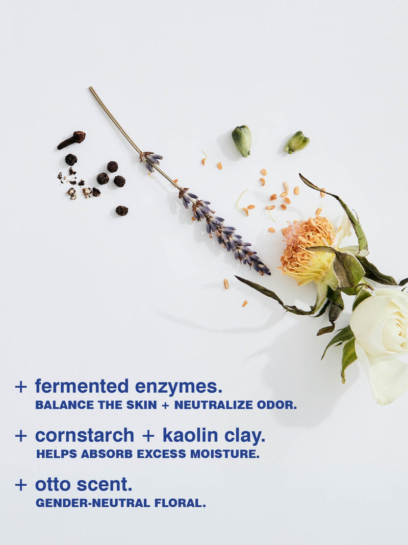 Fermented enzymes derived from the sugarcane plant to balance the skin + neutralize and control odor.. Cornstarch + kaolin clay absorbs excess moisture, keeping your underarms feeling fresh.. otto scent envelops you in a veil of opulence.