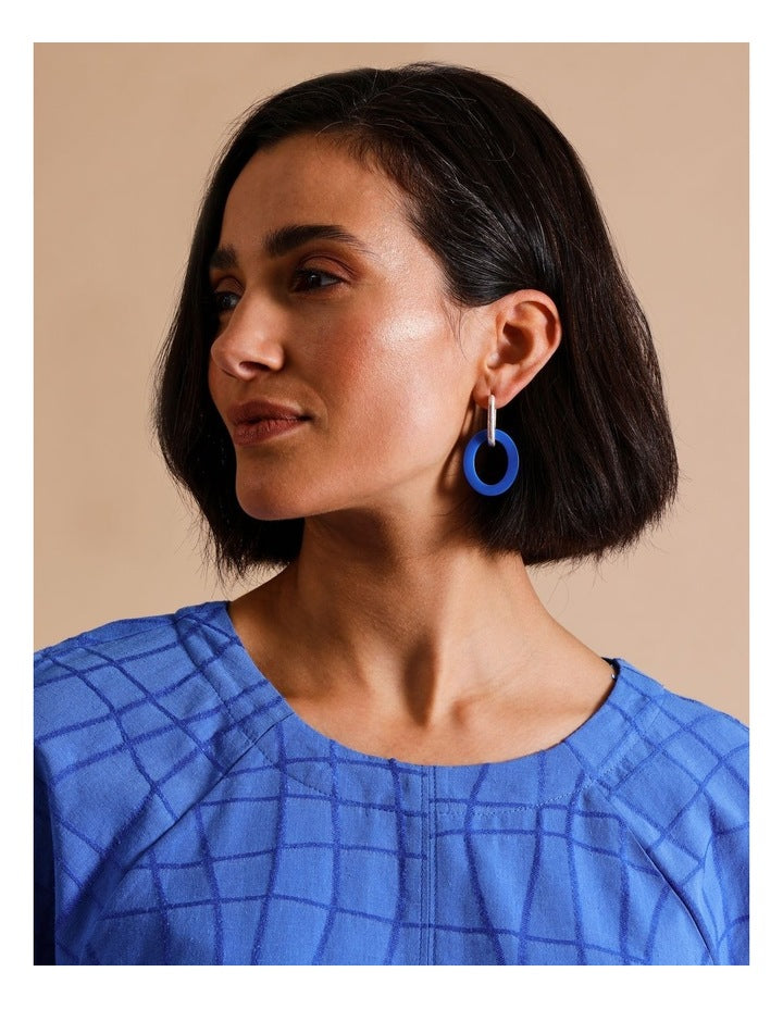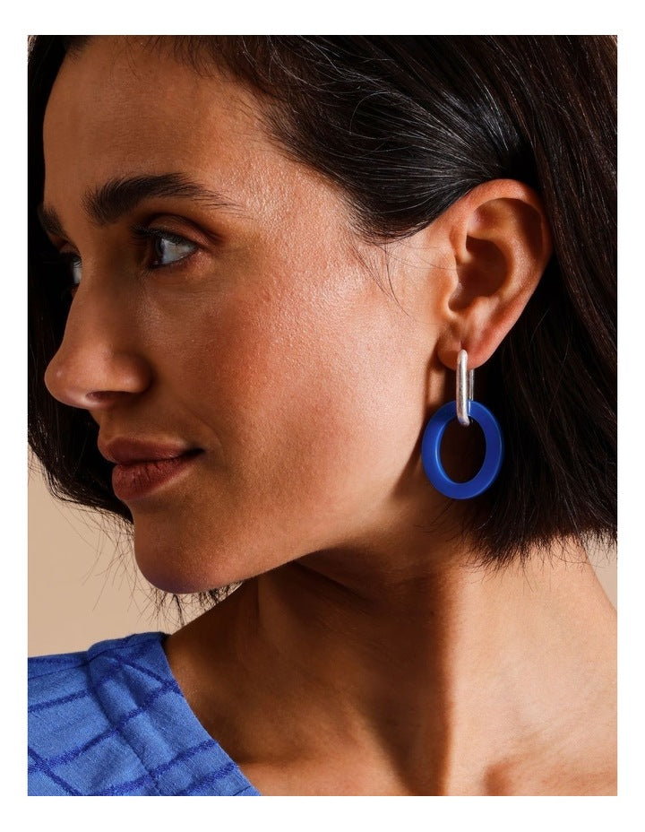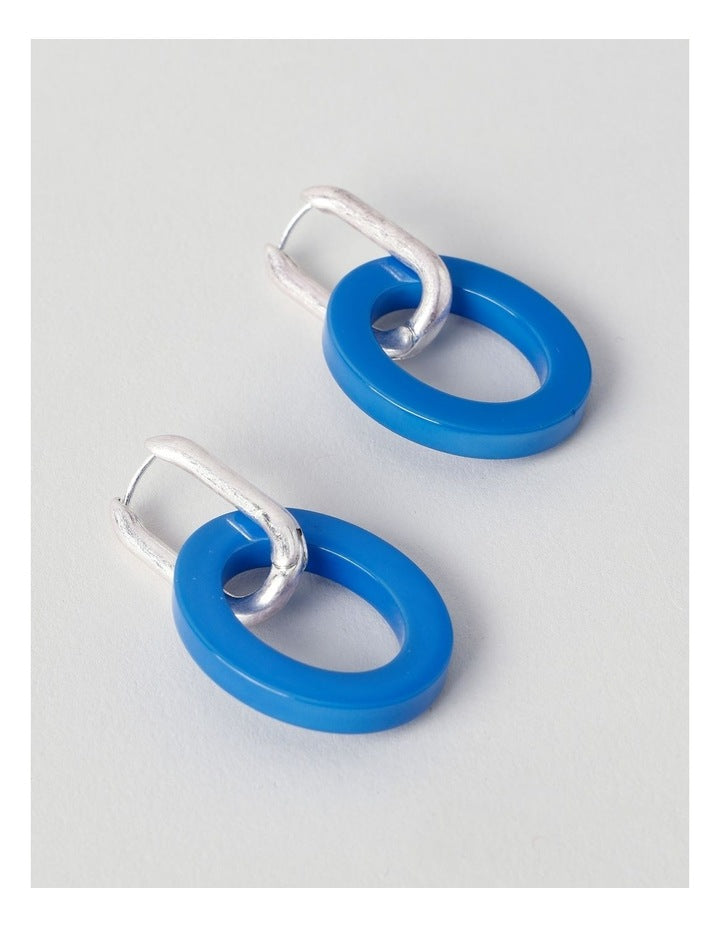 This earring is defined by its double-link design, featuring two interlocking ovals that create a modern, articulated silhouette. The lower link is distinguished by a solid, saturated blue hue, providing a bold contrast against the polished metallic finish of the upper connecting piece. The design's construction allows for subtle movement, blending a clean, geometric form with a distinct pop of color.