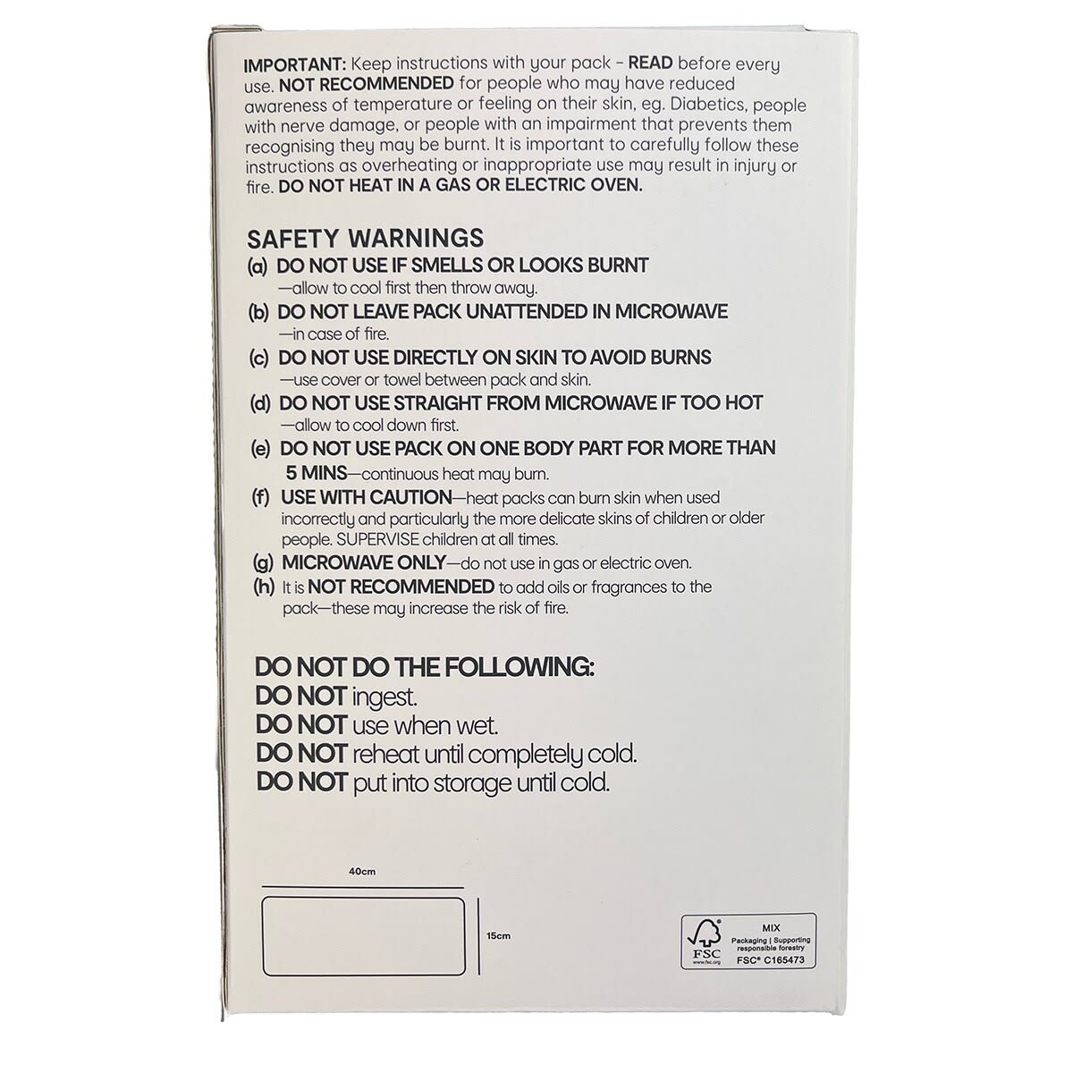 Not recommended for people who may have reduced awareness of temperature or feeling in their skin, e.g. diabetics, people with nerve damage, or people with an impairment that prevents them from recognising they may be burnt. It is important to carefully follow these instructions as overheating or inappropriate use may result in injury or fire. Do not heat in a gas or electric oven.