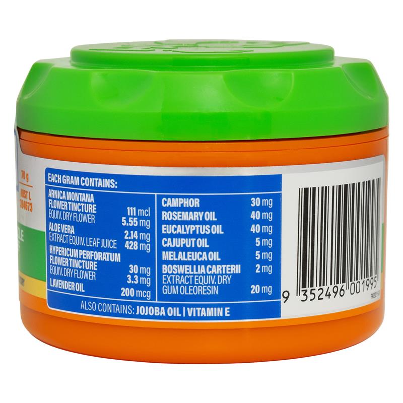 Each gram contains: Aloe Vera 2.14mg (Extract equiv. leaf juice 428mg), Hypericum Perforatum Flower Tincture 30mg (Equiv. dry flower 3.3mg), Arnica Montana Flower Tincture 111mcl microlitre (Equiv. dry flower 5.55mg), Boswellia Carterii extract 2mg (Equiv. dry gum oleoresin 20mg), Rosemary Oil 40mg, Lavender Oil 200mcg, Eucalyptus Oil 40mg, Cajuput Oil 5mg, Melaleuca Oil 5mg, Camphor 30mg. Also contains Jojoba Oil and Vitamin E. Contains: Alcohol 13.6% W/W & Benzyl Alcohol.