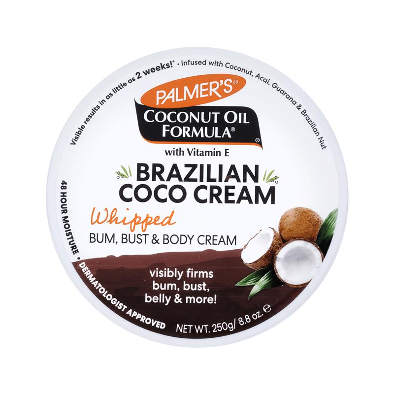 General Information Palmer's® Coconut Oil Brazilian Coco Whipped Body Cream visibly firms bum, bust, belly & more! Palmers® Coconut Oil Brazilian Coco Whipped Body Cream is clinically proven to visibly firm bum, bust, belly & more! Formulated with a powerful blend of nourishing & firming ingredients, including rich hydrator Coconut Oil, powerful brazilian super ingredients Guarana and Açai, plus Collagen & Elastin. Leaves skin feeling tight and toned with a decadent tropical scent. Suitable For: All Skin Types Product Claims: Visibly Firms and Tones Skin Size: 250g Dermatologically Approved?: Yes KEY FEATURES • Clinically proven to visibly firm and tone skin* • In an independent clinical study: 98% of participants saw visibly improved skin firmness o 94% saw reduced appearance of cellulite o 96% saw visibly smoother, less dimpled texture 98% saw tighter and firmer skin in problem areas. *Based on an 8-week independent clinical study with 50 participants. • Smooth, lightweight texture • 48 hour moisture • Dermatologist Approved