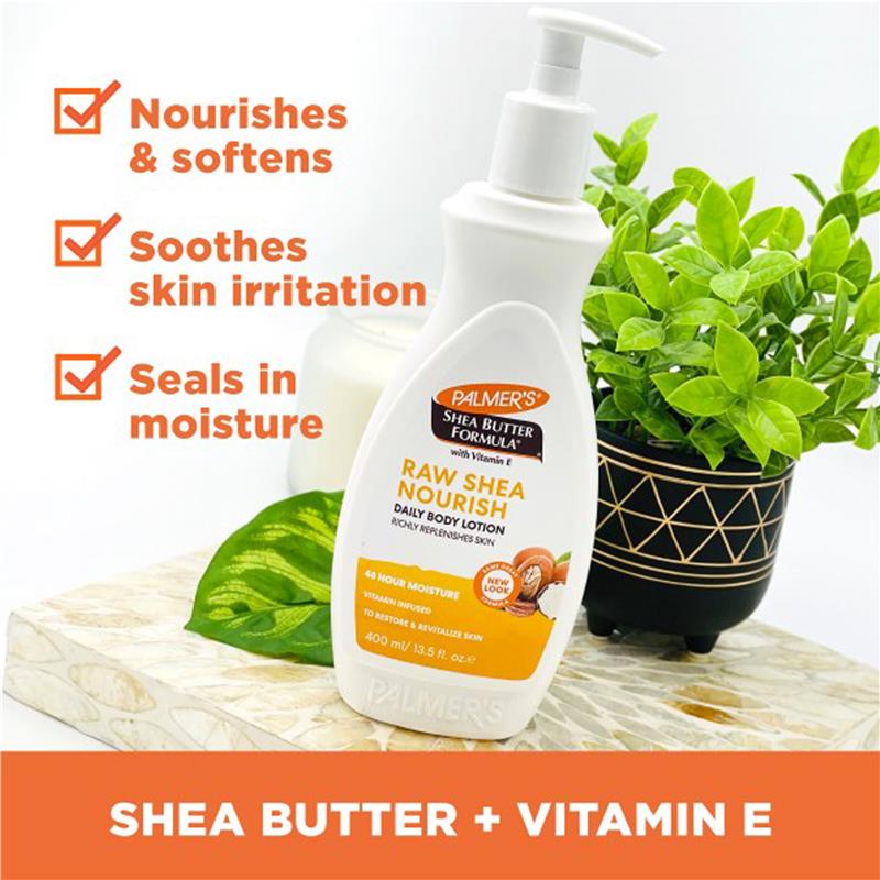 General Information Palmer's® Shea Butter Formula Body Lotion, is a daily body lotion to soothe and nourish skin, crafted with vitamin-enriched Shea Butter to richly replenish dry, sensitive skin. Now with 48 hour moisture. Soothe and nourish skin with Palmer's® Shea Butter Formula daily body lotion, crafted with vitamin-enriched Shea Butter to richly replenish dry, sensitive skin. Now with 48 hour moisture. Shea Butter is sustainably produced, and contains important vitamins and micro-nutrients, making it a superior skin-friendly moisturiser, particularly for soothing sensitive skin. Suitable For: All skin types Product Claims: Soothe and nourish skin Size: 400ml KEY FEATURES • Soothes and nourishes skin • Now with 48 hour moisture • To restore and revitalise skin • Great for sensitive skin • Paraben, Phthalate & Dye free. • No animal ingredients or testing • Ethically & sustainably sourced ingredients • Raw African Shea Butter