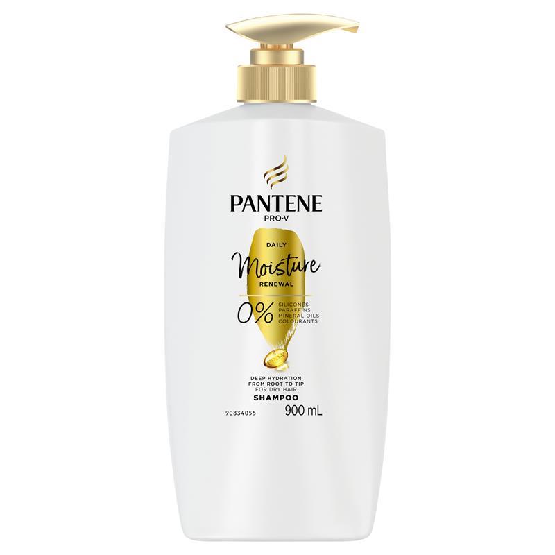 General Information Pantene Pro-V Shampoo Daily Moisture Renewal 900ml Pantene Pro-V Daily Moisture Renewal Shampoo has 0% silicones*, 0% grease^ to help give you lightweight smooth hair. It helps to provide deep hydration from root to tip. For dry hair; Infused with Pro-V Formula, it gently cleanses to strengthen hair from the inside-out.#Pantene Pro-V #Shampoo #Daily Moisture Renewal Size: 900 ML KEY FEATURES • Recommended for : Dry, parched strands • Gives healthy looking shine & smoothness to hair • 0% silicones*, 0% grease**, just lightweight smooth hair • Vitamin level tested by Swiss Vitamin Institute • *Selected variants • **Grease due to silicone