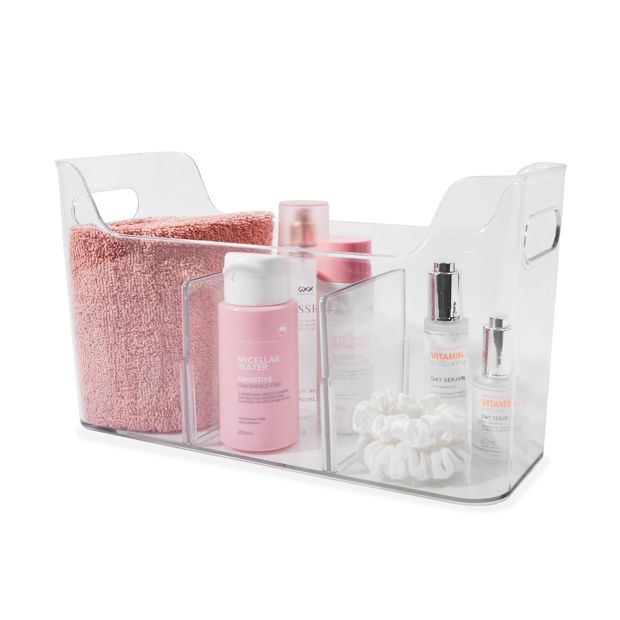 Product DetailsAccessories not includedIncludes 1 x bin and 2 x dividersDimensions/Size: Bin: 20cm (H) x 36cm (W) x 14cm (D)Dividers: 11.5cm (H) x 12.8cm (W) x 3cm (D)Colour: ClearFeaturesRectangle shapeCutout handleNarrow design